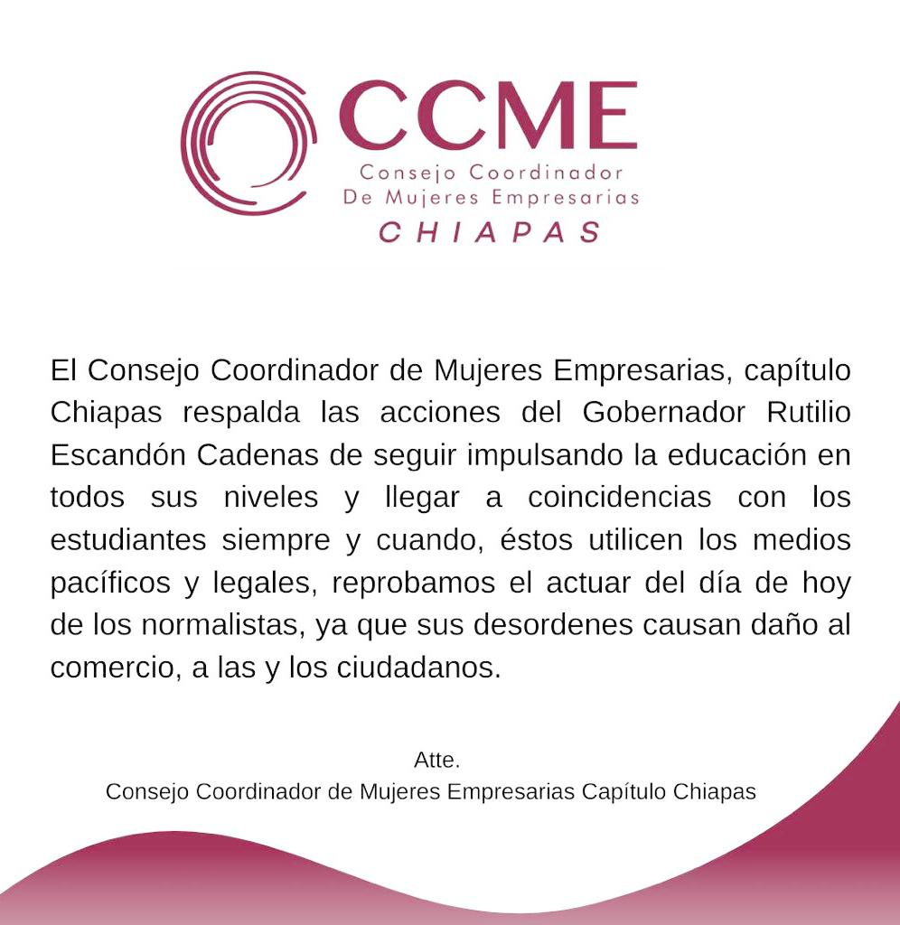 En este aspecto, el Consejo Coordinador de Mujeres Empresarias (CCME), Capítulo Chiapas, que dirige Beatriz Figueroa Cordoba, respaldó las acciones del gobernador Rutilio Escandón Cadenas de seguir impulsando la educación en todos sus niveles y llegar a coincidencias con los estudiantes siempre y cuando, éstos utilicen los medios pacíficos y legales, ya que sus desordenes causan daño al comercio y a las y los ciudadanos.