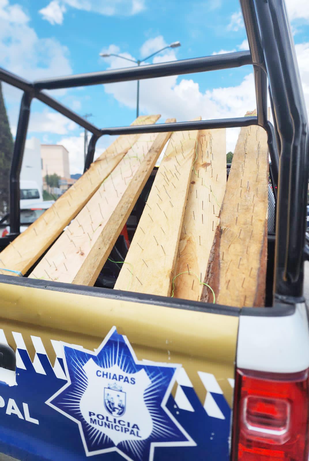 SCLC.- Elementos de la Policía Municipal, Policía Estatal Preventiva y de Tránsito Municipal, implementaron dispositivo preventivo a la altura del km. 46 del tramo San Cristóbal a Chiapa de Corzo, con el objetivo de garantizar el libre tránsito en esta importante vía de comunicación. Durante dicho dispositivo, en el que se dio seguimiento a un grupo de estudiantes inconformes del municipio de Zinacantán que regresaban de la capital del estado, luego de los hechos ocurridos la tarde de este viernes en la caseta de cobro de la súper carretera San Cristóbal de Las Casas-Chiapa de Corzo, donde no les permitieron el tránsito, los elementos policiacos aseguraron varios objetos, entre palos, tablas con clavos, piedras, llantas y otros objetos que transportaban en autobuses, los cuales dejaron tirados al notar la presencia de los cuerpos de seguridad.
