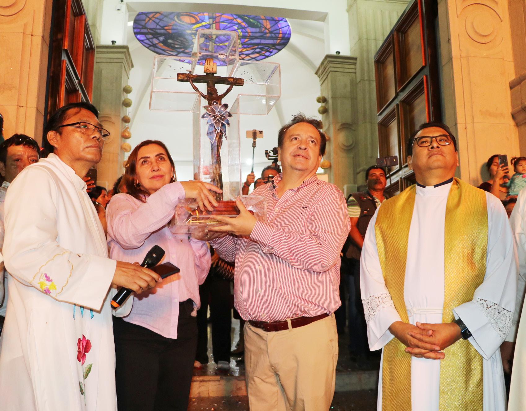 VillaFlores.- Este sábado 07 de enero se realizó el anuncio de la feria la cual dio inicio con la procesión del Señor de Esquipulas por calles y avenidas de la ciudad, el alcalde Mariano Rosales Zuarth, su esposa Margarita Sarmiento Tovilla y sus hijos Mariano y Emiliano, así como el párroco Jesús Israel Hernández Gómez, encabezaron el paseo de casi 4 horas que terminó en el atrio de la parroquia. El recorrido partio con la presencia de feligreses, la cual al pasar por las calles se fueron sumando familias enteras para acompañar al Señor de Esquipulas y a las autoridades municipales y eclesiásticas.