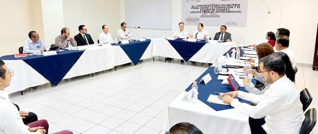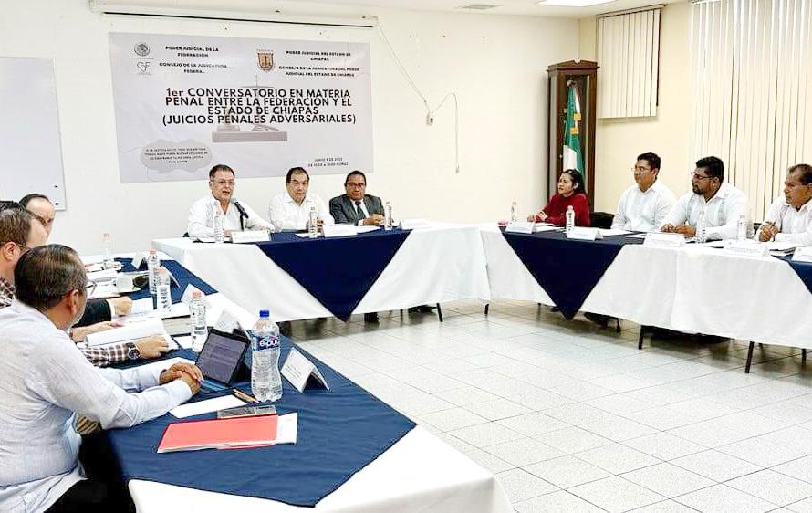 Mientras que el coordinador de Magistrados de Tribunales Colegiados de Circuito en Tuxtla Gutiérrez, Pedro Guerrero Trejo, reconoció al magistrado presidente Guillermo Ramos Pérez, por la buena voluntad e interés en llevar a cabo este Primer Conversatorio entre ambas instituciones judiciales, e invitó a las y los participantes a expresarse y debatir en total libertad y respeto. En la mesa de debate por parte del Poder Judicial de la Federación estuvieron: el juez del Centro de Justicia Penal Federal en el Estado de Chiapas con Residencia en Cintalapa, Eligio Valdenegro Gamboa; el juez del Centro de Justicia Penal Federal del Estado con Residencia en Cintalapa, Jorge Arturo Acero Díaz; juez Primero de Distrito de Amparo y Juicio Federales en el Estado de Chiapas, Alex Conrad Hayton Herrera; el magistrado presidente del Primer Tribunal Colegiado en Materias Penal y Civil del Vigésimo Circuito, Fidel Quiñones Rodríguez y el magistrado del Primer Tribunal Colegiado en Materias Penal y Civil del Vigésimo Circuito,