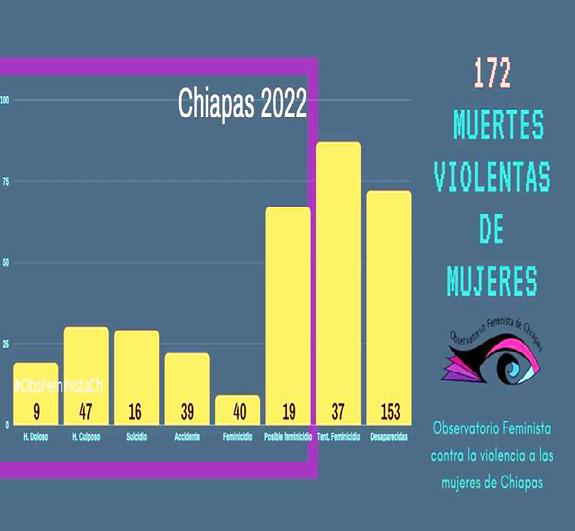 En 2021, según el Observatorio, en la entidad chiapaneca se registraron 203 muertes violentas de mujeres, de las cuales 26 fueron tipificadas como feminicidios y 82 como tentativa de feminicidio, mientras que en 2020 la cifra alcanzó 177 decesos violentos (dentro de éstos, 47 fueron feminicidios y 87 tentativa de feminicidio).