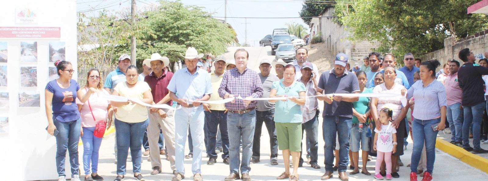 Villaflores.- El presidente del Ayuntamiento de Villaflores Mariano Rosales Zuarth, inauguró la pavimentación de calles realizada con concreto hidráulico en el ejido Agrónomos Mexicanos, se hizo acompañar por el comisariado ejidal Genaro Mendoza Gumeta, el agente municipal Martín Hernández Sarmiento, presidente del COPLADEM Adelaido Cabrera Morales y habitantes del mismo. El alcalde Rosales Zuarth destacó que su principal objetivo es transformar el municipio para un mayor desarrollo, pavimentando calles para mejorar el tránsito peatonal y vehicular, así también se realiza el mantenimiento de iluminación para la seguridad de los habitantes, agradeció al gobernador Rutilio Escandón Cadenas por trabajar en unidad y por enviar los diferentes apoyos para el mejoramiento del
