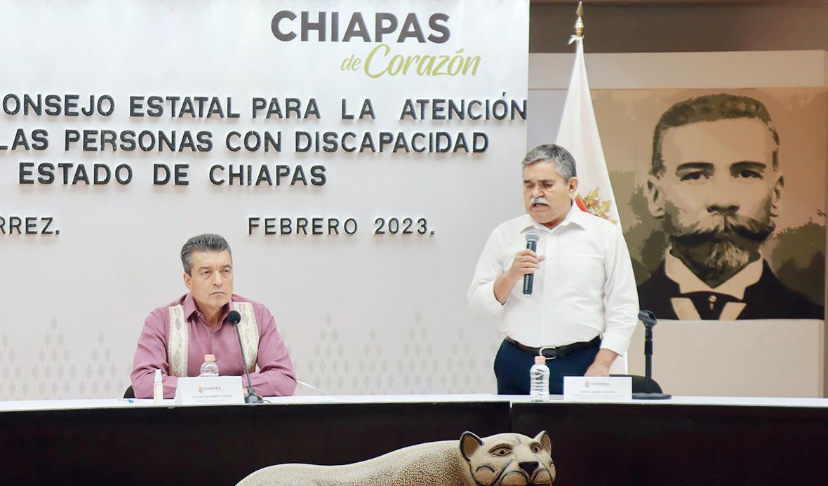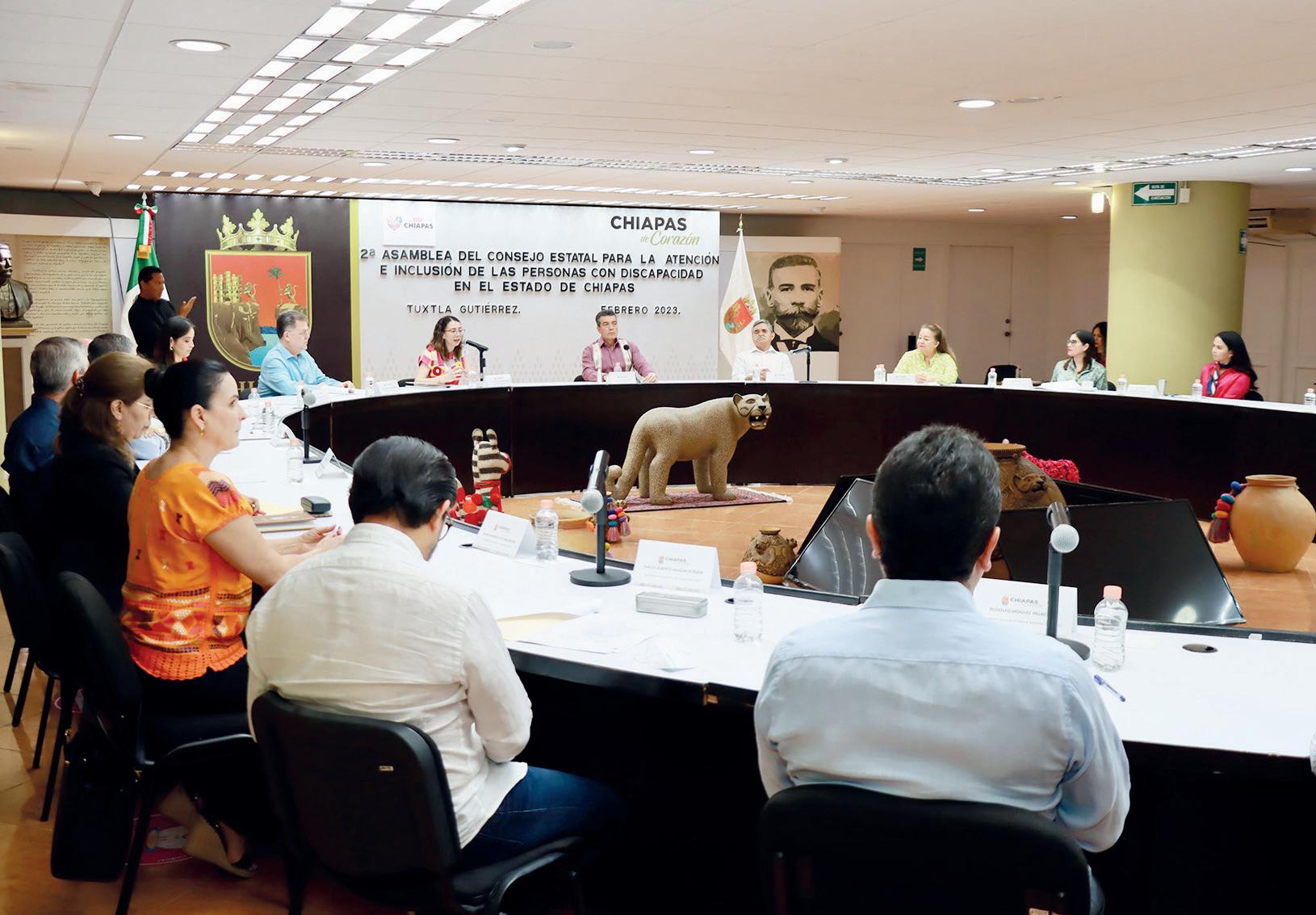 La directora del Sistema DIF Chiapas, Deliamaría González Flandez, expuso que se renuevan los trabajos del Consejo Estatal para la Atención e Inclusión de Personas con Discapacidad, que es presidido por el gobernador del estado e integrado por 10 personas sevidoras públicas del Gabinete Legal y Ampliado, quienes se encargan de atender las peticiones de los grupos que representan a cada una de las discapacidades que existen, por lo que llamó a sus compañeras y compañeros a sumarse a este proyecto. Por su parte, el secretario de Protección Civil, Luis Manuel García Moreno, resaltó datos informativos sobre las acciones que se llevan a cabo en coordinación con los tres órdenes de gobierno a fin de prevenir y combatir los incendios forestales que hasta el corte del 20 de febrero son 15 en todo el estado. Informó que el Mega Simulacro de Sismo se celebrará el próximo 20 de marzo a las 12 horas, con la participación de instituciones de todos los niveles, las cuales se encuentran capacitadas y organizadas para este ejercicio.