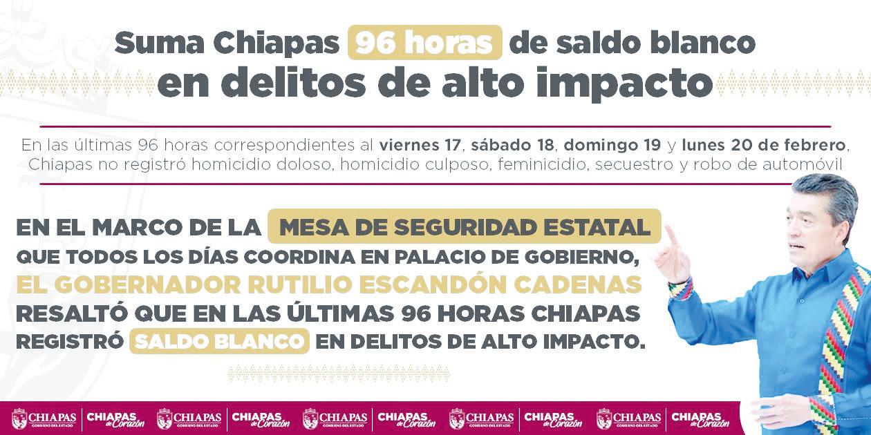 “En las últimas 96 horas correspondientes al viernes 17, sábado 18, domingo 19 y lunes 20 de febrero, Chiapas registró saldo blanco en delitos de alto impacto, como homicidio doloso, homicidio culposo, feminicidio, secuestro y robo de automóvil. Este resultado nos motiva a continuar redoblando esfuerzos