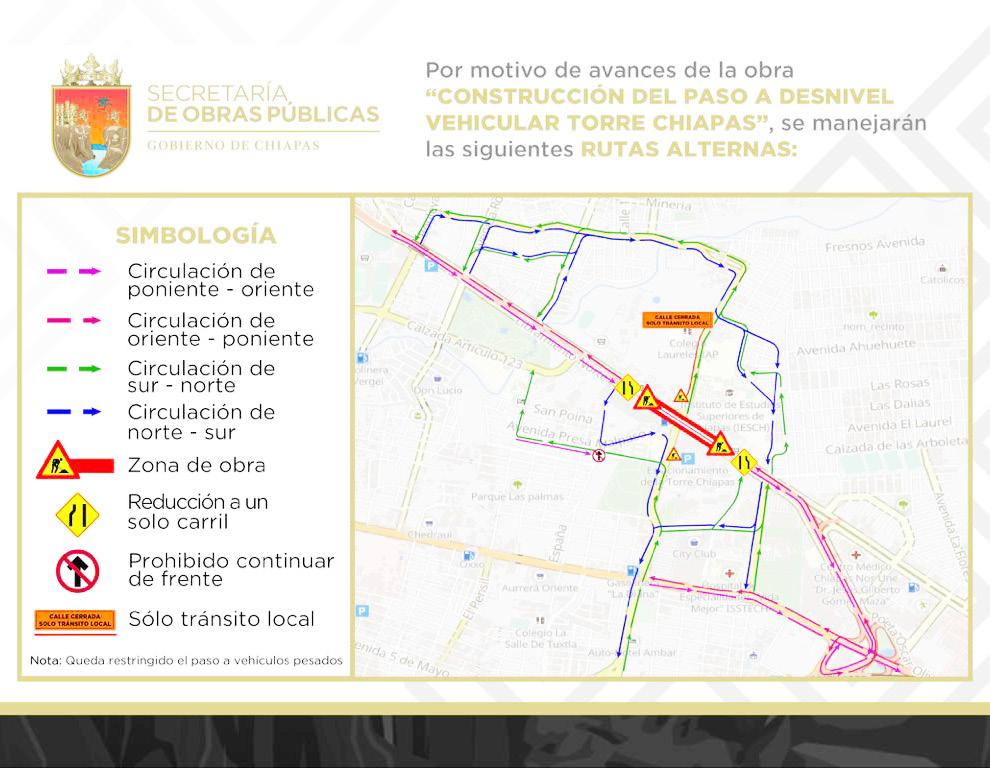 Tuxtla.- La Secretaría de Obras Públicas del Estado informó acerca de la modificación de rutas alternas que se implementarán el próximo viernes 24 de febrero por motivo del avance del “Paso a Desnivel Torre Chiapas”, en Tuxtla Gutiérrez.
