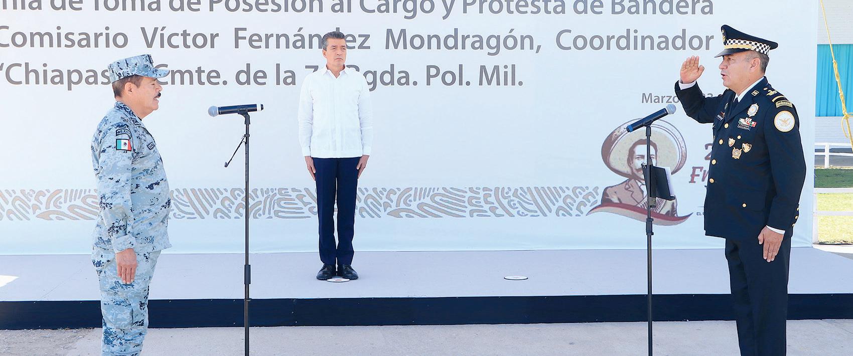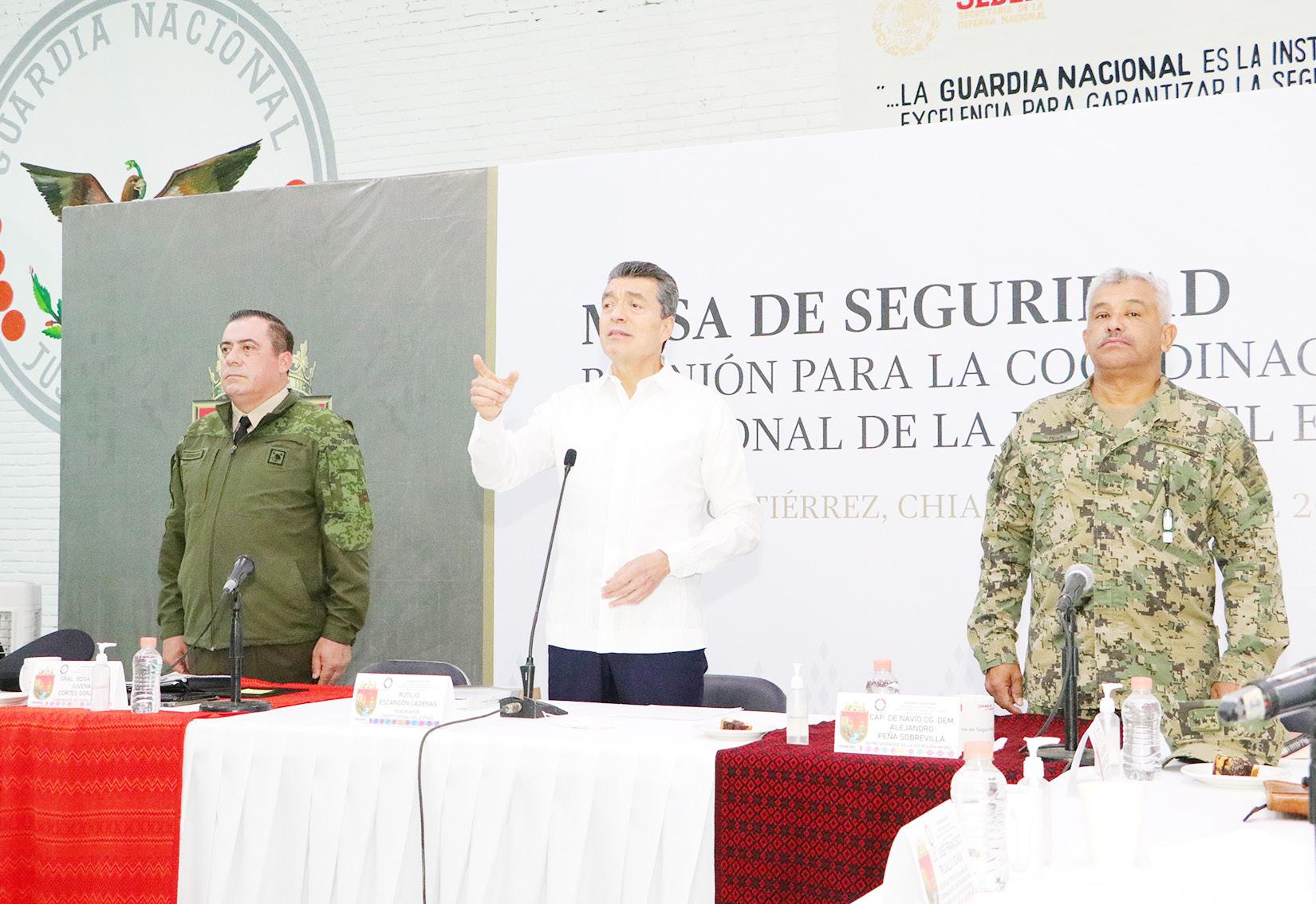 En este marco de la Mesa de Seguridad, el gobernador dio la bienvenida al nuevo coordinador de la Guardia Nacional en Chiapas, Víctor Fernández Mondragón, a quien le expresó su respaldo para trabajar en unidad a fin de fortalecer el bienestar, la paz y la seguridad del estado y del país.