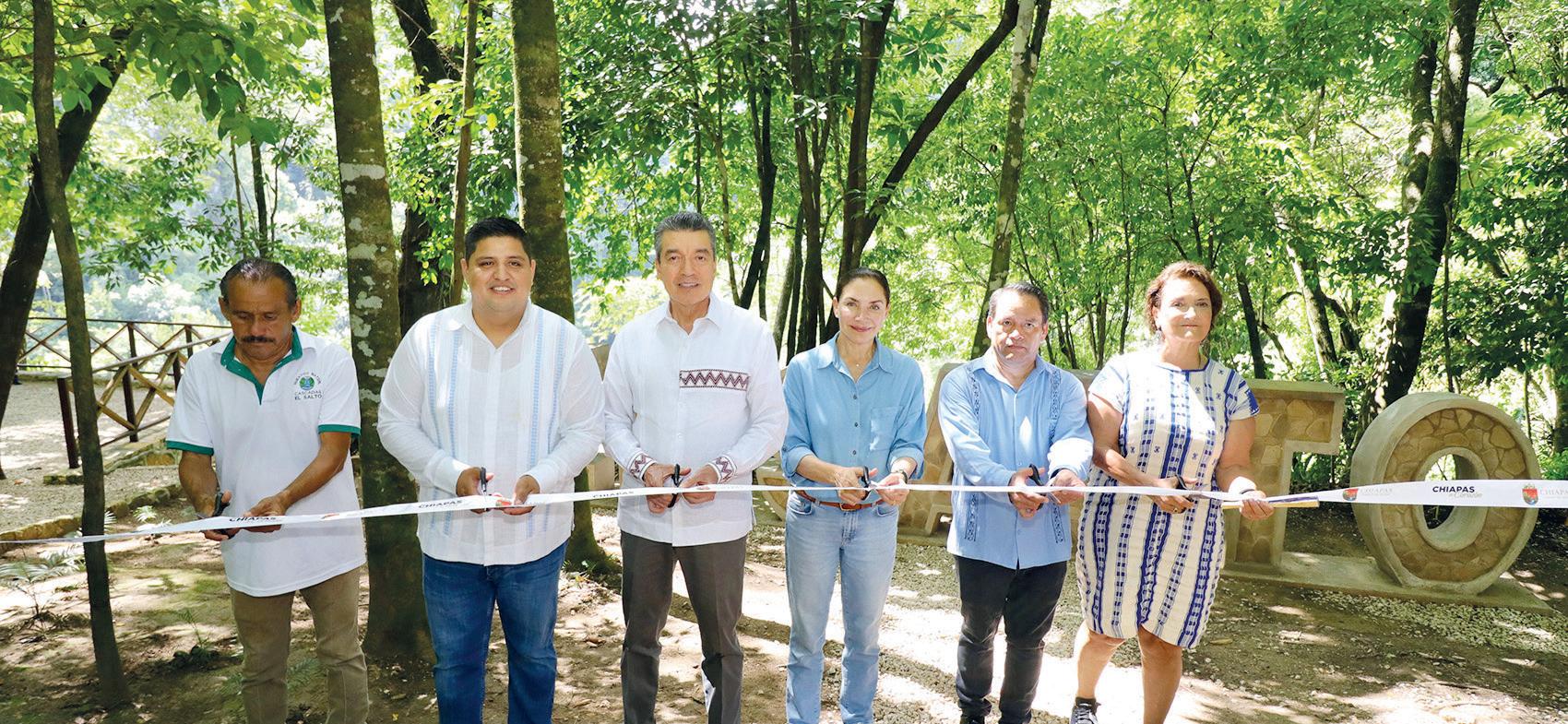 Tuxtla.- Al inaugurar el Centro Turístico Cascada Huextoc Natzin “El Salto”, en el municipio de Palenque, el gobernador Rutilio Escandón Cadenas celebró que cada vez se consoliden más espacios turísticos sustentables y sostenibles, que contribuyen a la economía y permiten a la gente disfrutar de forma responsable las maravillas naturales de Chiapas. Luego de caminar hacia el mirador desde el que se observa esta cascada, ubicada en la localidad Reforma de Ocampo, Escandón Cadenas refirió que el estado tiene gran belleza natural y cultural, sin embargo, el tesoro más grande es su gente buena y trabajadora, como la que habita en este lugar que, dijo, encierra una gran fortaleza de la flora y fauna, en la selva tropical.
