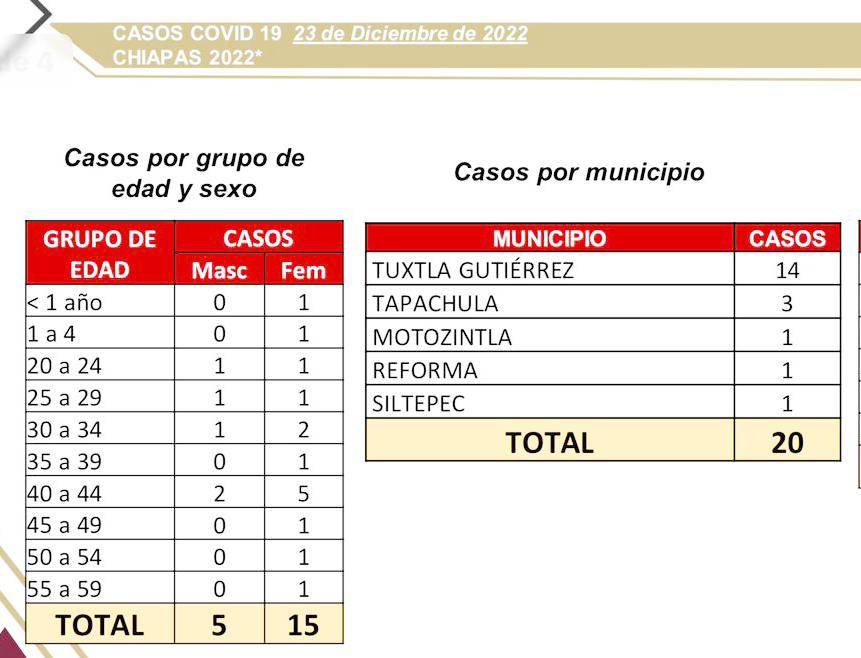 Tuxtla.- En las últimas horas se reportaron 20 casos de COVID-19 en cinco municipios de Chiapas, dos de ellos en menores de edad, da a conocer la Secretaría de Salud del estado.