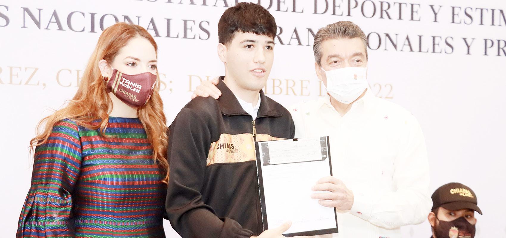 apoyados económicamente, pues representa una motivación a que sigan trabajando con disciplina, dedicación y amor a Chiapas. Nuestro deseo es brindarles todo lo necesario para que estén en óptimas condiciones y puedan cumplir sus metas y sueños deportivos”, apuntó. Resaltó que Chiapas está alcanzando grandes logros en este rubro, muestra de ello es que en 2022 se obtuvieron 15 medallas más, entre éstas cuatro preseas de oro, en una comparativa con 2021, lo que significa que las y los representantes chiapanecos se preparan cada vez mejor. “Estoy seguro de que vamos a seguir ganando medallas y que su alta preparación nos permitirá tener más atletas representando a Chiapas en próximos