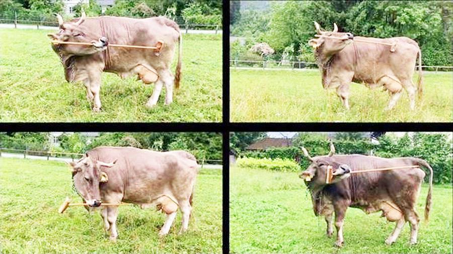 Witgar Wiegele, el dueño de esta vaca, se percató hace más de diez años que ella a veces cogía palos con la boca y los usaba para rascarse. Este comportamiento atrajo atención científica por primera vez cuando se grabó en video