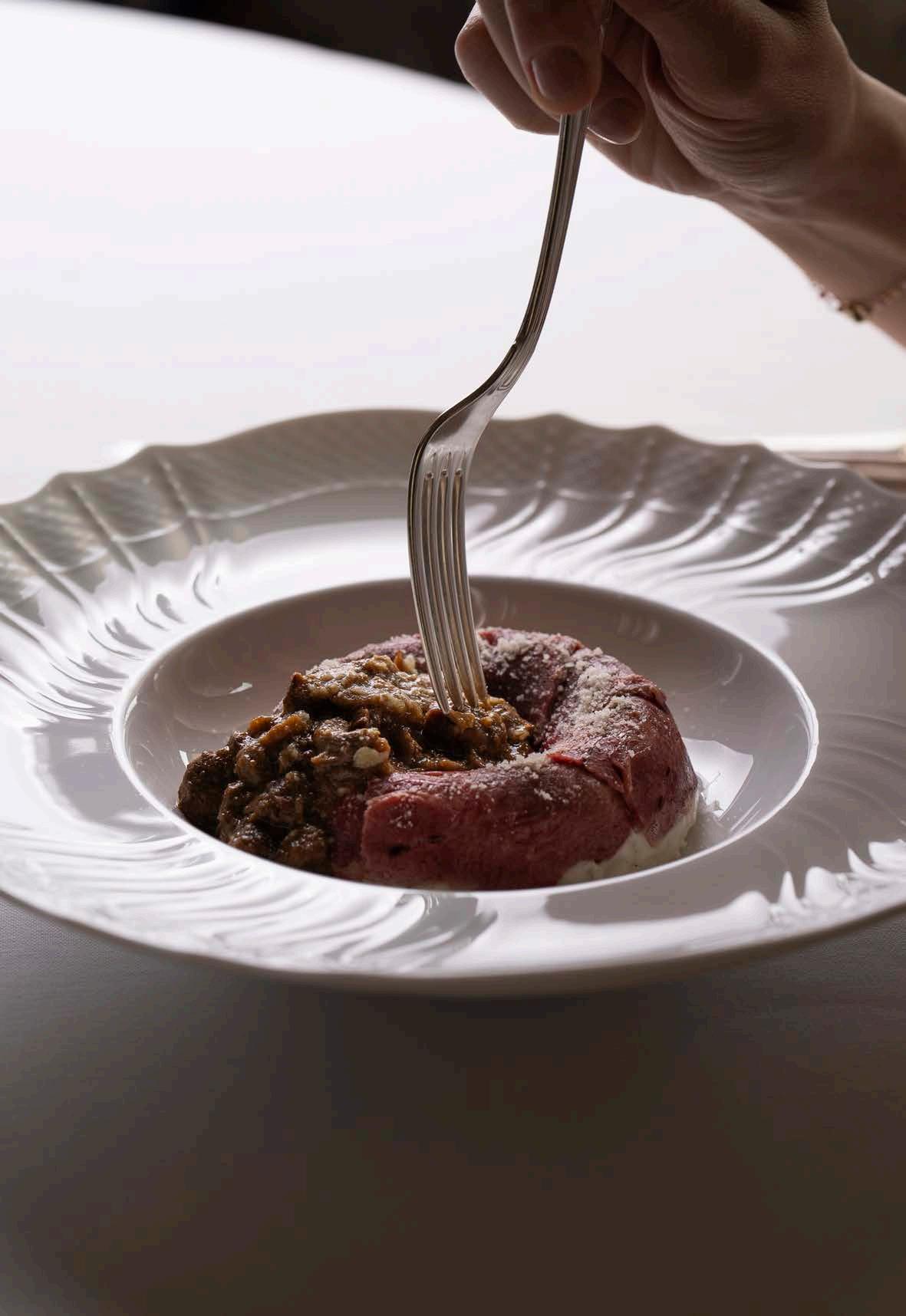 zano, una sorta di timballo di riso cotto nel brodo e mantecato, con un cuore di ragù di piccione (o altro animale da piuma) e porcini secchi, ricoperto di pangrattato e gratinato al forno. Un piatto golosissimo, con un umami stratificato e inteso, quello della cipolla, del Parmigiano, della maillard da rosolatura e del fungo. Gioca un campionato simile anche il Savarin di Riso, piatto iconico della bassa parmense che Jacopo Malpeli, talentuoso chef dell’Osteria Del Viandante di Rubiera, interpreta fedelmente secondo la ricetta di Mirella Cantarelli, che diede vita al piatto. Lingua salmistrata a fasciare una ciambella di risotto alla parmigiana con al centro polpettine di manzo e maiale fritte, servite con un sugo a base di pomodoro e funghi. Una liturgia nota e una dimensione gustativa ricca e intensa, dominata da una sapidità complessa, quella delle carni e del formaggio ma anche dell’essenziale apporto dei vegetali. Ma non serve nemmeno cercare nella ricchezza dei nostri ragù e primi piatti, ci basta ricordare il sapore di una marinara. Si chiama Umaminara, ed è ormai un signature tra le proposte di Confine a Milano: San Marzano DOP affumicato, crema d’aglio rosso di Nubia, pasta e colatura di alici, gel di basilico, crema di datterini, polvere di capperi, olive, aglio nero, origano, basilico greco e olio EVO. Una versione rivisitata ma nemmeno troppo per una delle pizze che più rappresentato la tradizione Campana in un morso direi quasi didattico. Ricco, pieno, saporito e intenso, o se preferite, umami e kokumi.