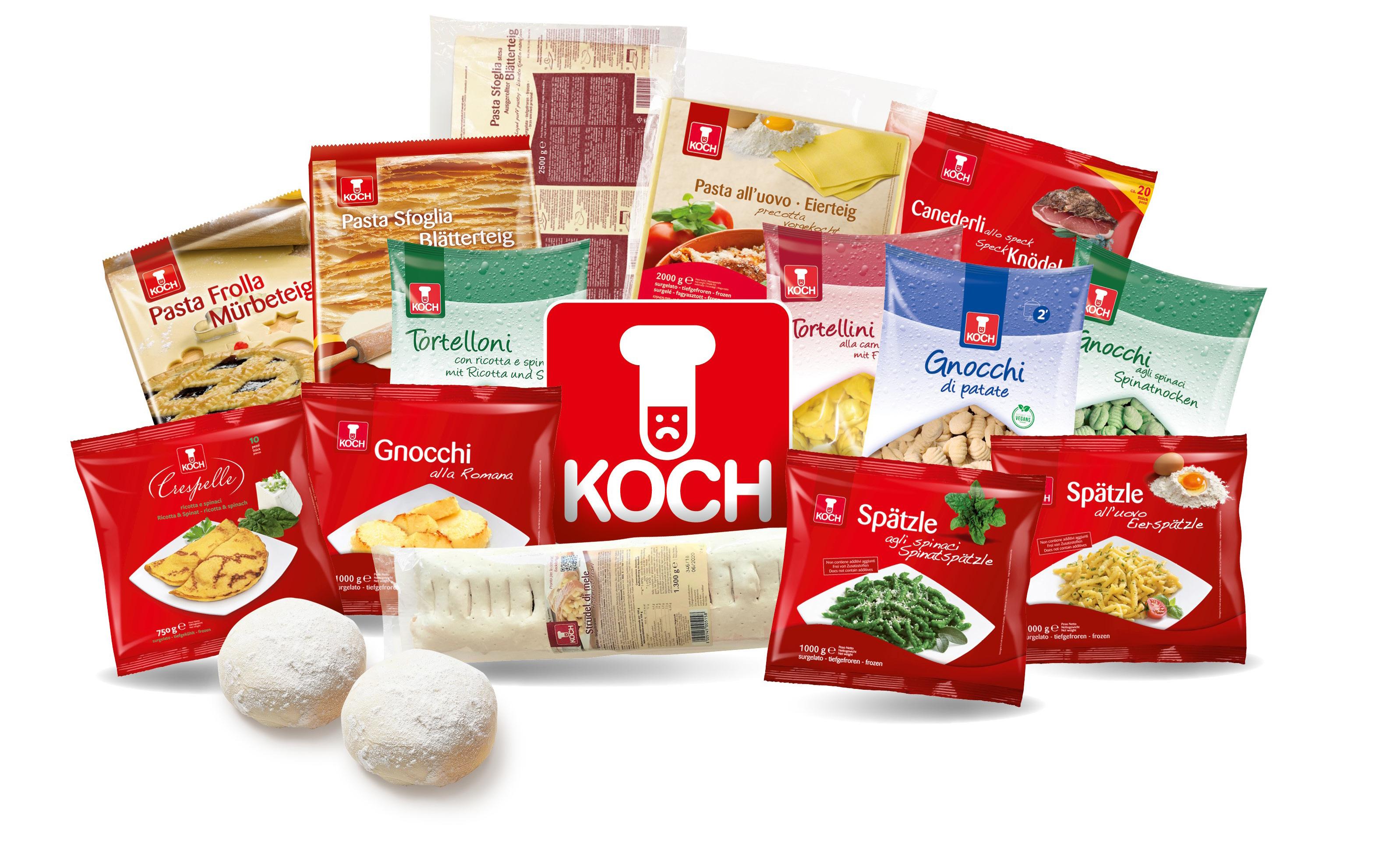 li, spätzle all’uovo, ravioli di ricotta e spinaci, lunette e strudel di mele i protagonisti di Koch – il nome non è scelto a caso, in tedesco significa “cuoco” e vuole identificare emblematicamente l’origine e il carattere dell’azienda – poi la gamma si allarga ai piatti tradizionali italiani, dalle lasagne agli gnocchi, i tortellini e molto altro, per abbracciare infine una varietà di prodotti il più completa possibile fino a un assortimento vasto di paste sfoglia, di dolci, sughi e proposte vegetariane.