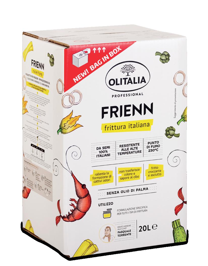 Con Frienn friggi più a lungo e ottieni sempre risultati perfetti. Massima stabilità alle alte temperature, riduzione di schiuma e cattivi odori: Frienn permette di ottenere fritti croccanti, asciutti e dal colore chiaro, rispondendo al meglio a tutte le esigenze della ristorazione di alta qualità. Nato da una formulazione specifica, non trasferisce né colore né sapore ai cibi. Da oggi anche nel pratico formato Bag in Box da 20L