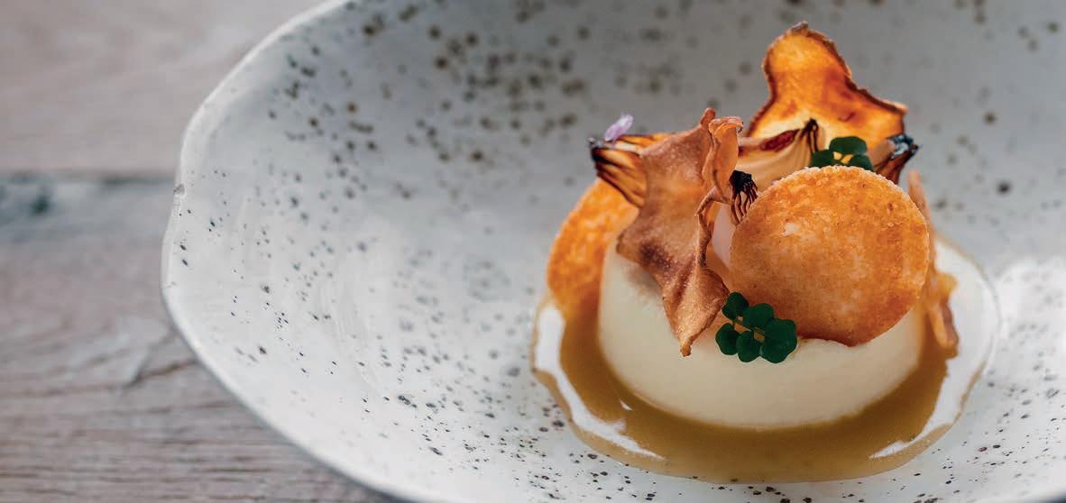 Fior di latte di Agerola, polpa di olive dolci pugliesi, quenelle di baccalà, polvere di cappero, chips di Parmigiano Reggiano DENIS LOVATEL