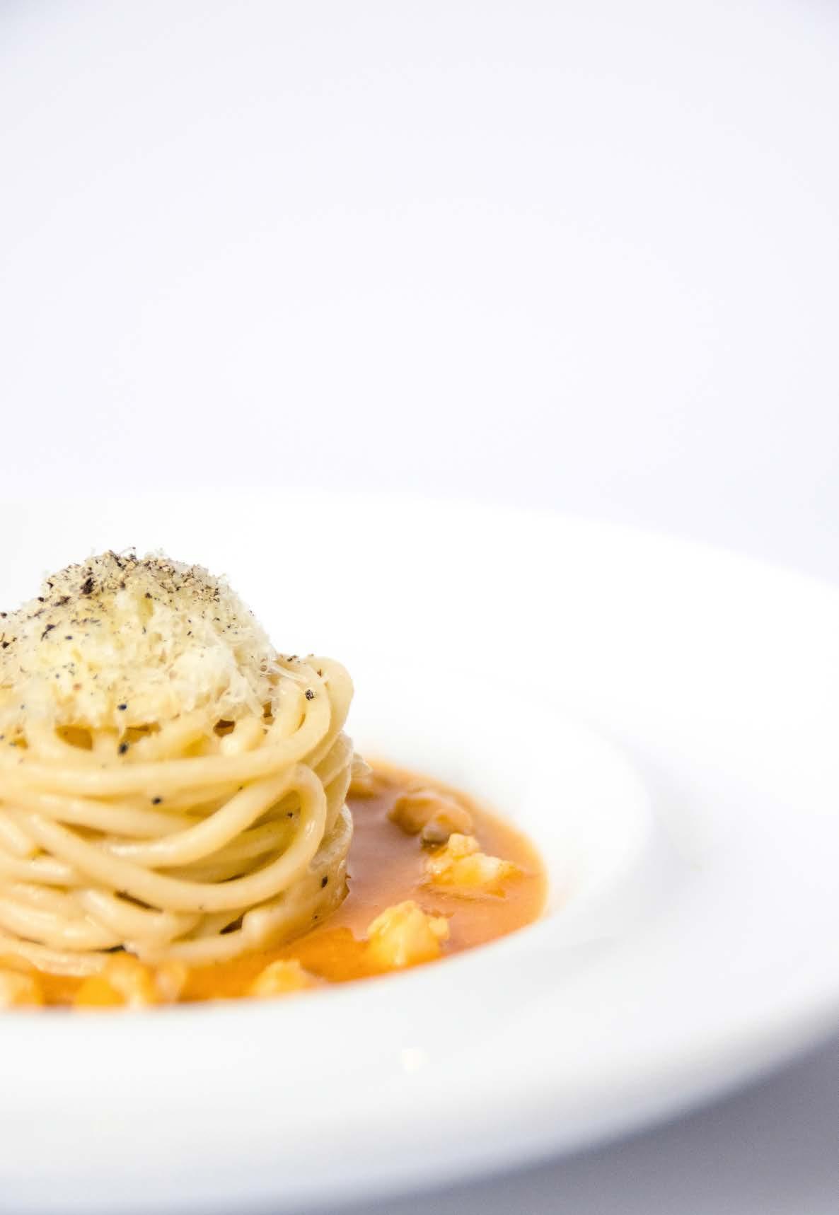 Spaghetti cacio e pepe con guazzetto di scorfano dell'Adriatico