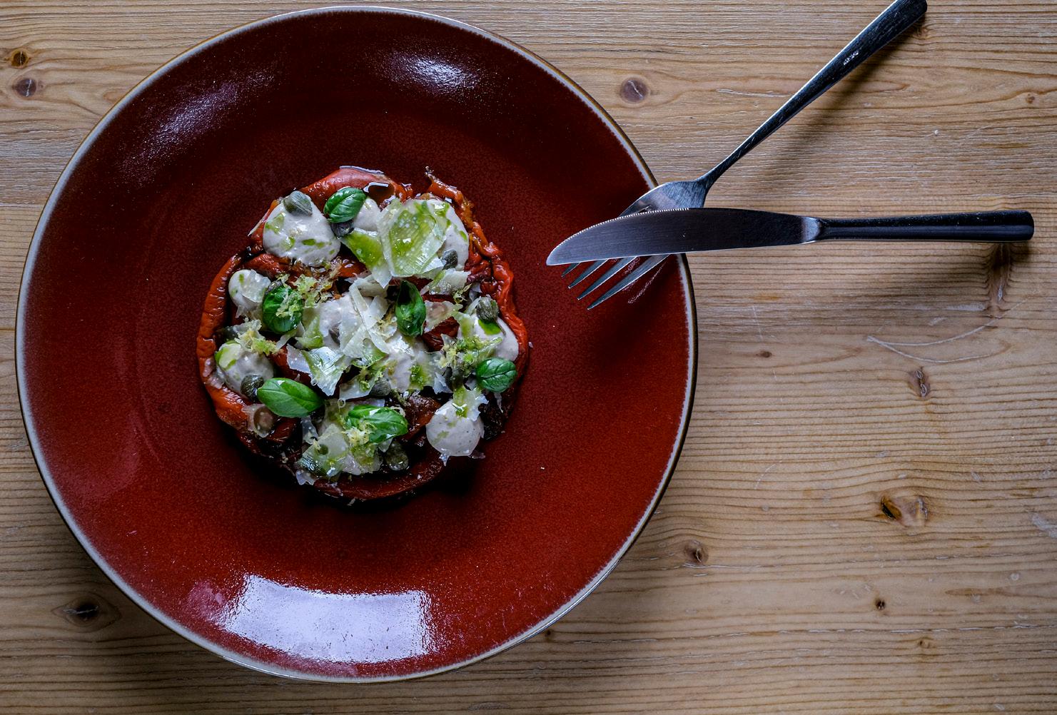 “Tra terra e mare” è una battuta di girello di carne irlan dese e scampi condita con maionese al whiskey, fragole, foglie di menta o basilico e fiori eduli.