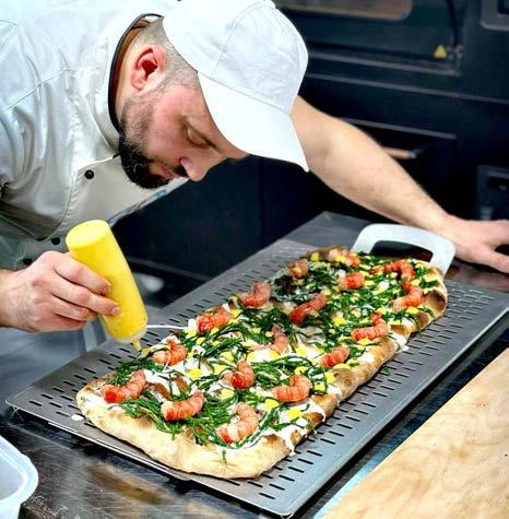 Spiega Elia: “Il mio socio Simon è originario della Val Badia e dall’Alto Adige ci riforniamo di molti prodotti straordinari che utilizziamo per la farcitura delle nostre pizze, come lo speck e il formaggio con cui decoriamo la pizza, arricchita anche con porcini scuri affumicati e noci. È una pizza molto ricca di sapori e piace molto”.