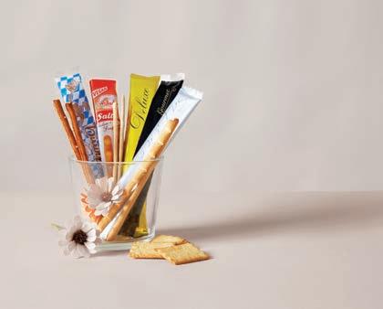 Dalle proposte classiche a quelle più innovative, la gamma comprende i classici grissini, perfetti per ogni occasione dall’aperitivo alla cena, anche in versione integrale e al rosmarino per incontrare i gusti di tutti; i Torinesi della tradizione piemontese; proposte più originali come i Birrini, ispirati ai tipici bretzel e le novità appartenenti alla gamma, cosiddetta, monocromatica: referenze confezionate in packaging lineari, di un solo colore, buste originali e riconoscibili che danno un tocco in più alla tavola. Fanno parte di questo gruppo i Deluxe, bastonicini di grano tenero con olio di girasole alto oleico e un pizzico di sale in superficie; gli sfiziosi Gourmet, sottili grissini stirati e a lenta lievitazione che si distinguono in tavola per la confezione nera, riconoscibile. Infine i Satiné la cui ricetta, con olio extravergine di oliva, è studiata per offrire un prodotto ricco di iodio, privo di grassi animali e di conservanti e fonte di fibre. A completare la linea i Rustici, dall’aspetto casereccio e il tipico gusto che ricorda quello del pane.