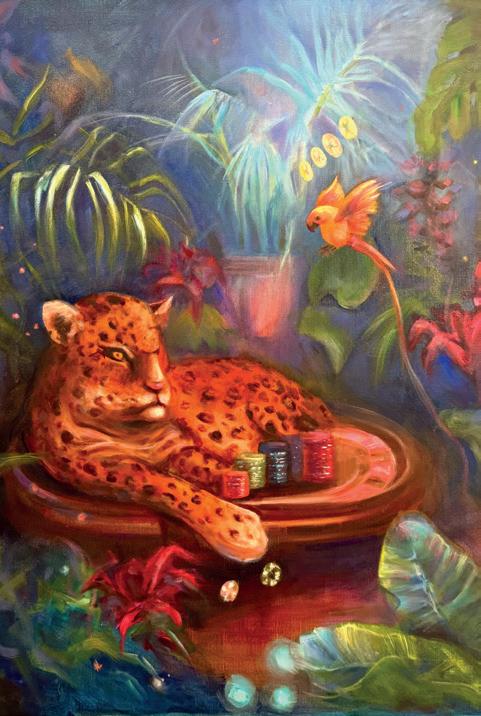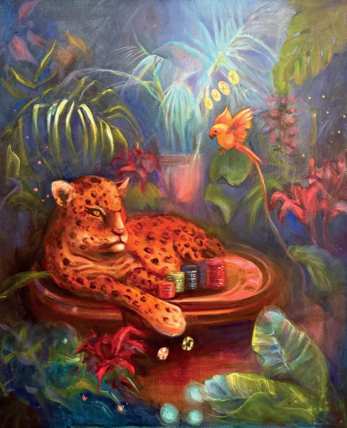 Em uma floresta tropical, uma onça descansa ao lado de ouro e chips de casino, inspirado pela lenda da Mulher-Onça. A artista Anna Bukhareva, de Los Angeles, explora crença, desejo e poder através de trabalhos figurativos, simbólicos e surreais, exibidos e colecionados internacionalmente.