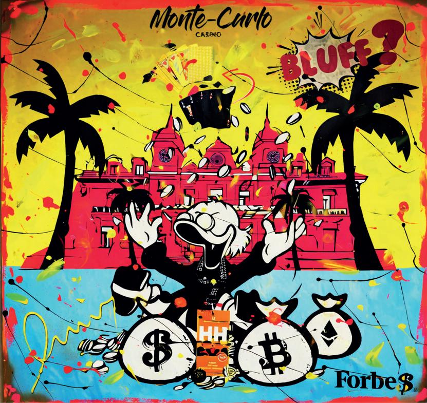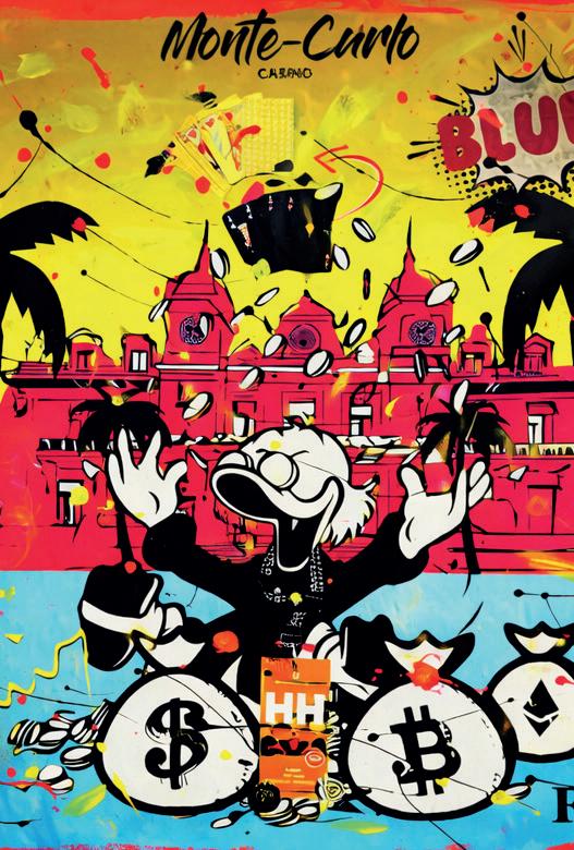 MONTE-CARLO is a mixed-media canvas featuring a 2011 Monaco Grand Prix pass and Casino de Monte-Carlo chips. EMÍR blends pop icons with authentic materials, exploring real versus perceived success and engaging collectors in the narrative.