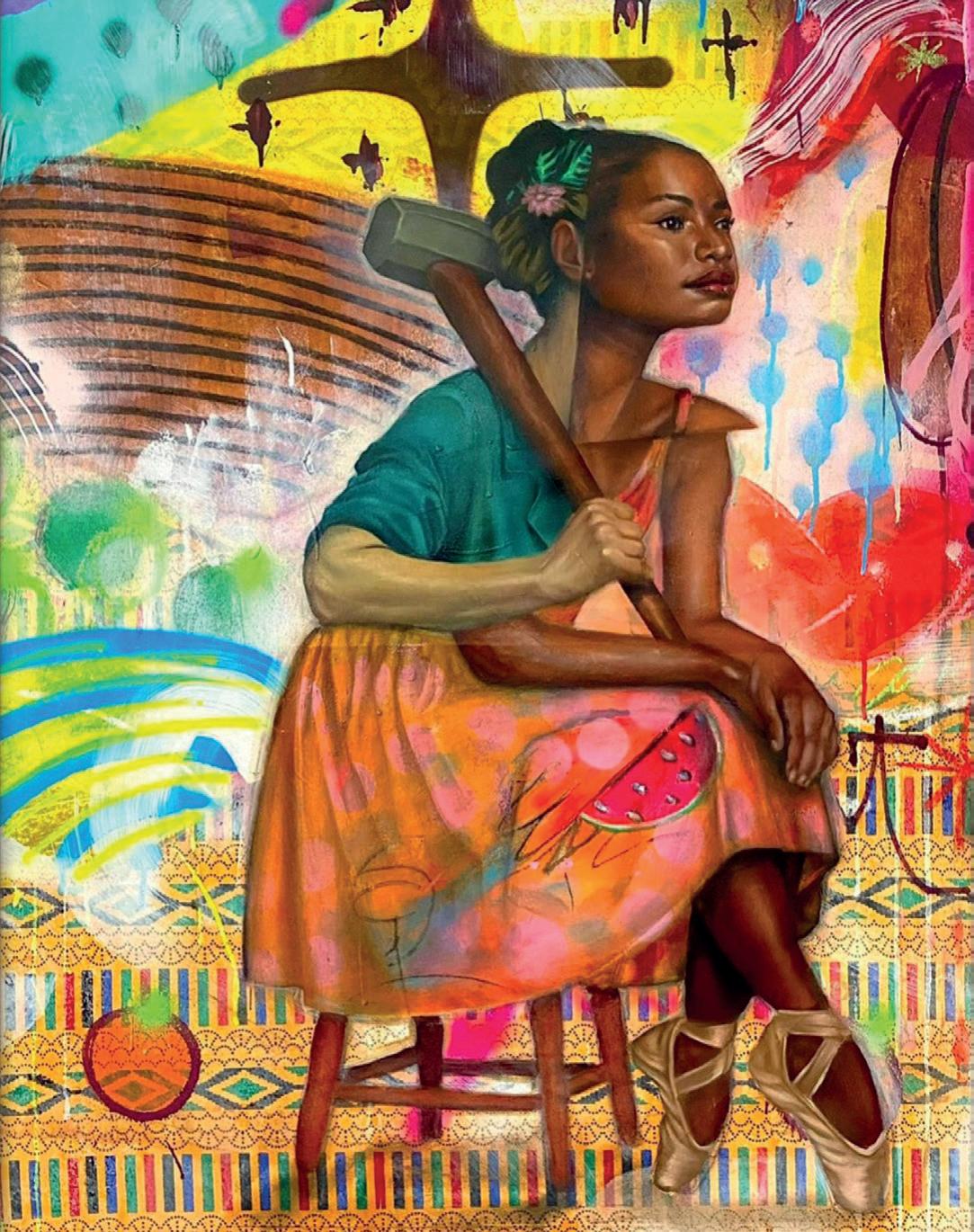 Leiga’s energetic, gestural painting with Muito Prazer’s precise figure, creating a character of strength and delicacy. Leiga blends pixação, graffiti, and fine arts in playful, vibrant compositions.