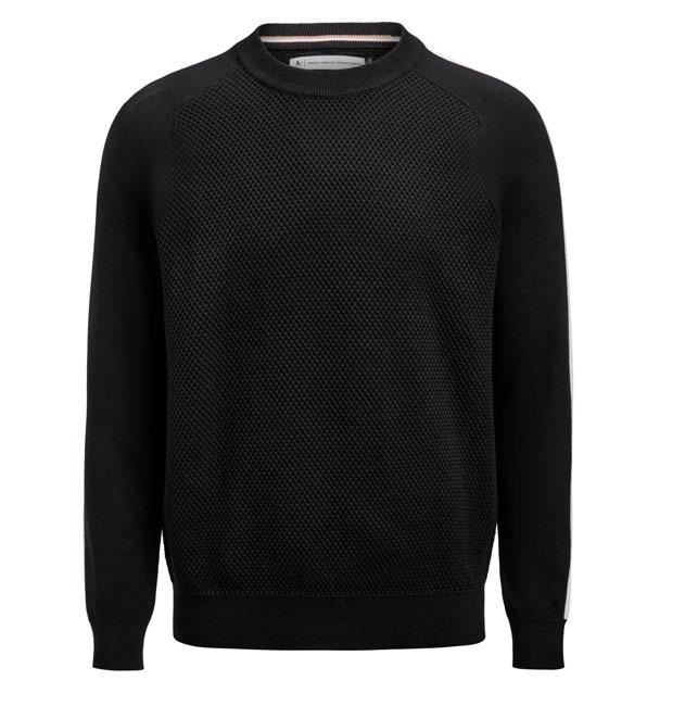 Scarsdale-tröjan – en klassisk tröja med en modern touch. Den har en strukturerad stickning på fram- och baksidan som ger textur och djup, medan raglanärmarna är prydda med två kontrastfärgade ränder för en sportig och modern känsla.