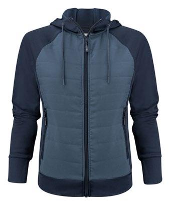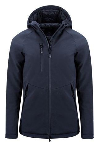 Hybridjacka, i vind- och vattentät softshell samt värmequiltad interlock med god andasfunktion. Fleecefodrad och med huva.