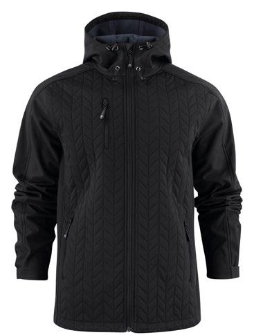 Softshell; 96% polyester, 4% elastan bondad med 100% PES fleece, 280 g/m². WP 10000/MVP 4600. Kropp: 100% polyester värmequiltad interlock med microfleece, 280 g/m². WP 800/MVP 6000