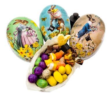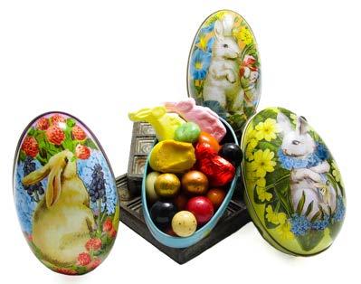 1993S Sanderson Metallegg, 4 assorterte motiver 100g kr 115,- pr stk. Min. 12. Fylt med assortert Påskeblanding.
