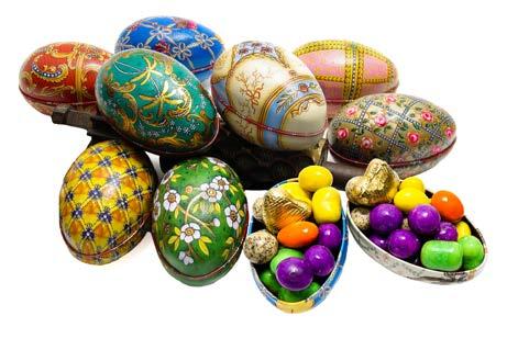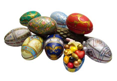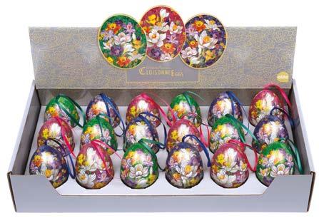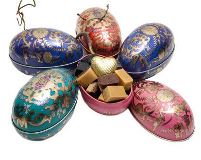 1993AT Vakre Fabergé Metallegg, 36 assorterte motiver 100g kr 115,- pr stk. Min. 12. Fylt med assortert Sjokoladeblanding.