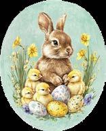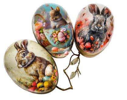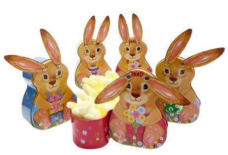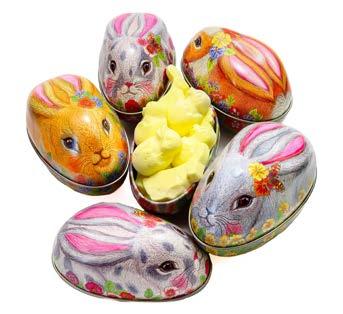 1993B Harefamilie Metallegg, 4 assorterte motiver 100g kr 115,- pr stk. Min. 12. Fylt med assortert Påskeblanding.