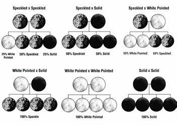 Speckle Park cattle colour patterns can be defined by four colour patterns, white, leopard, speckled and solid black. Leopard and speckled colour patterns are genetically the same with a differing degree of spotting.