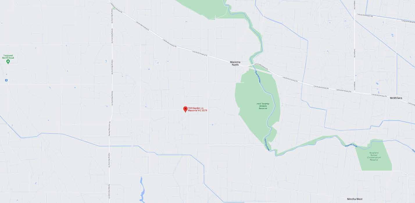 Head South on Murray Valley Highway then right onto LeithvilleKerang Road, travel approx 9km and turn right onto Mills Road. Then right onto Hayden Lane.