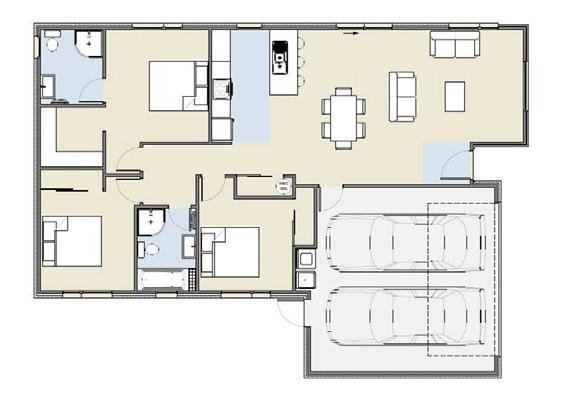 This modern and low maintenance TaraIti plan offers three double bedrooms including a master bedroom, complete with an ensuite and walk-in wardrobe.