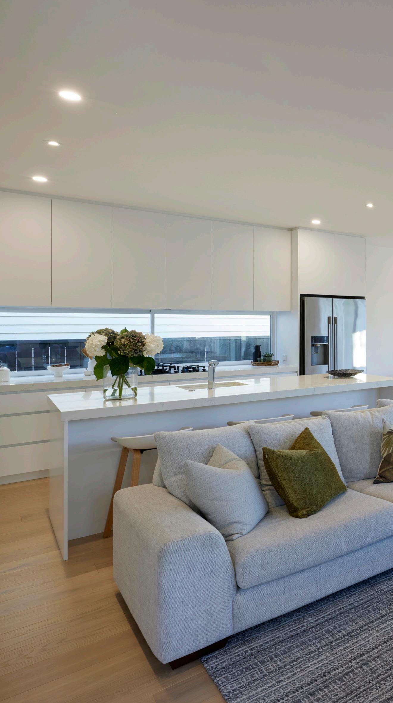 The striking pavilion ceiling helps to create the illusion of more space and contributes to a Hamptons-inspired home. The neutral colour palette inspired by New Zealand’s beautiful coast, helps to define a Hamptons-style home with a Kiwi touch.