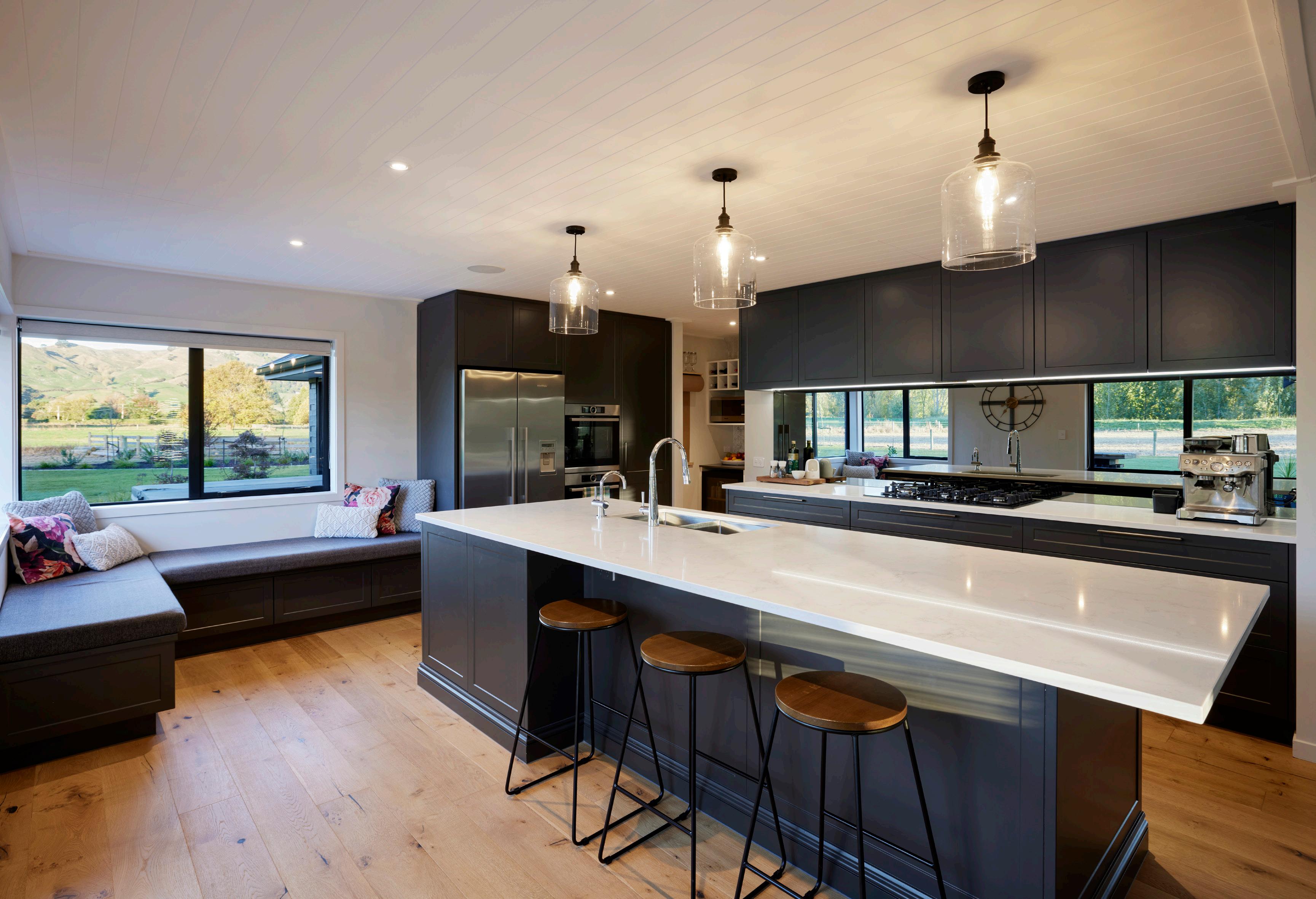 Inside the relaxed country feel is bought to life with a modern country kitchen, complete with shaker cabinets, a sundrenched window seat, barn doors, and Hardie Grove Lining on the entry, kitchen, dining and living area ceilings.