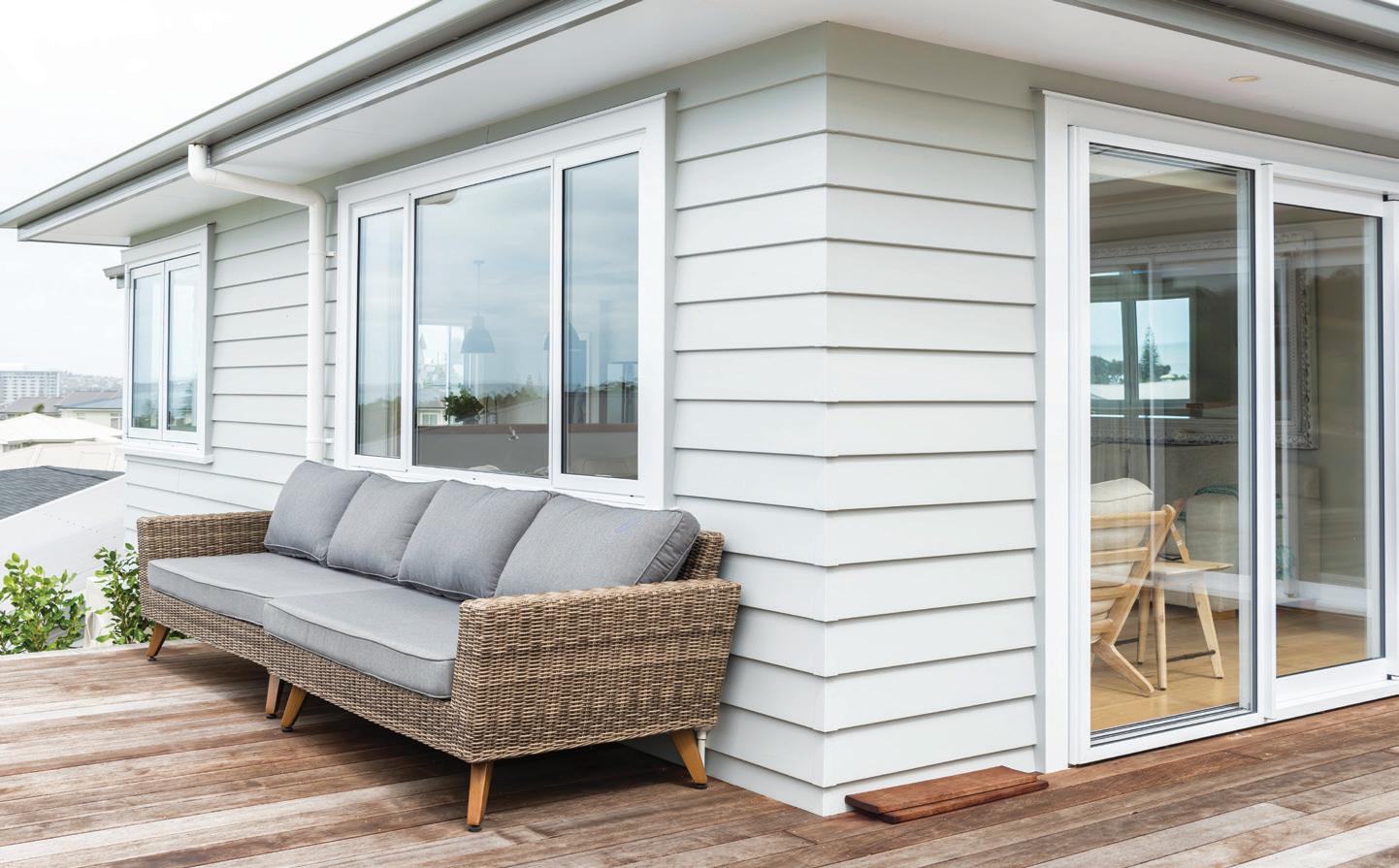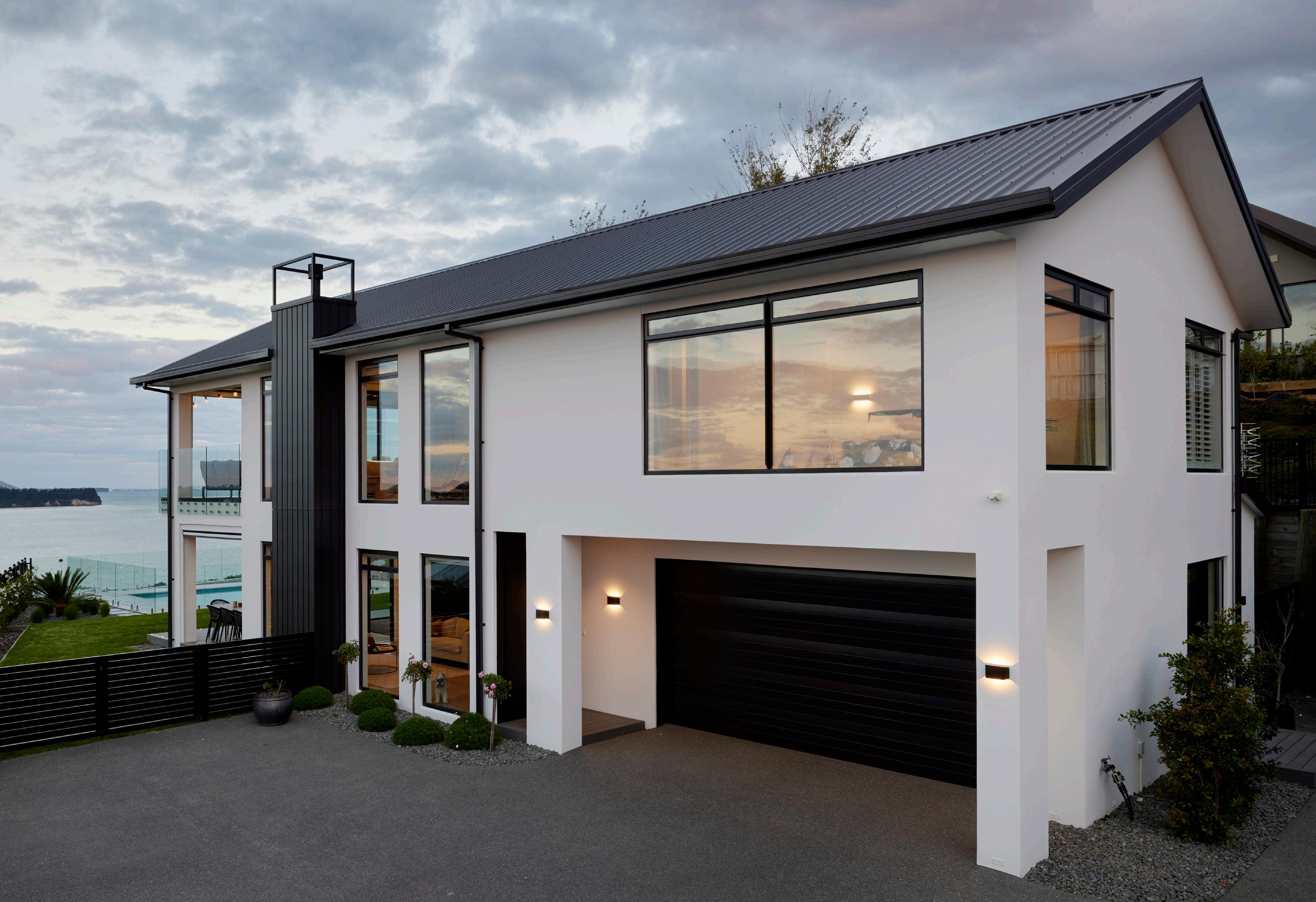 The striking exterior façade was achieved using Horizontal Lineaboard in Resene Double Cod Grey, and crisp white accents accentuating the look.