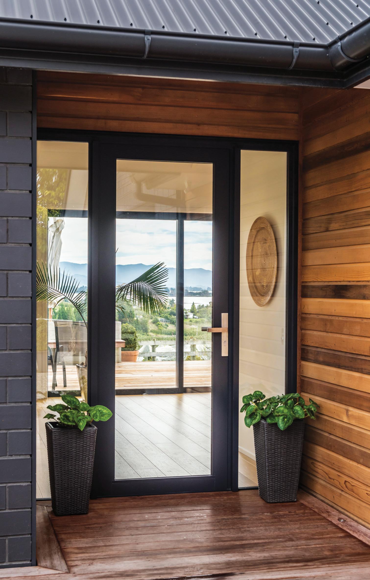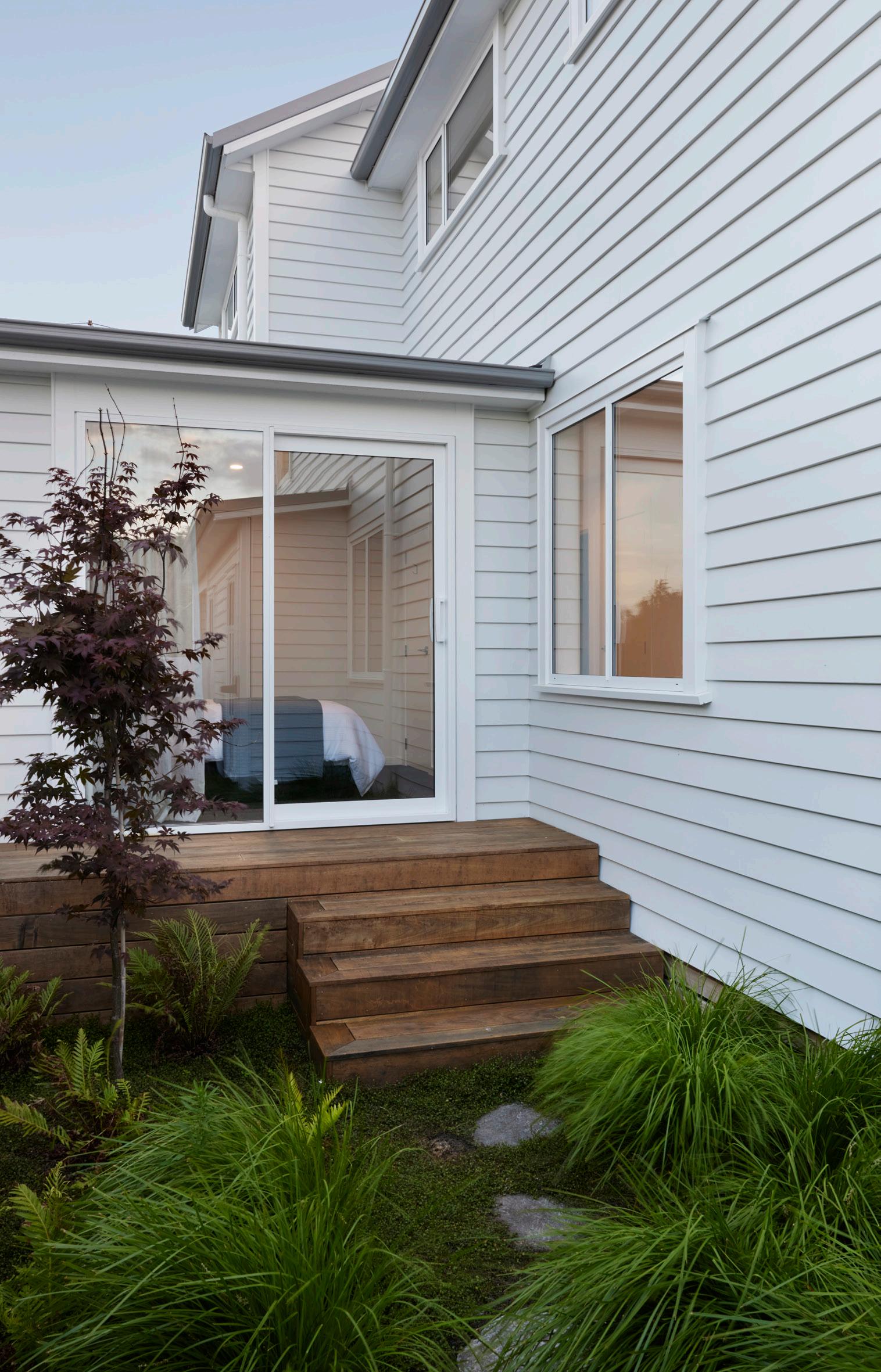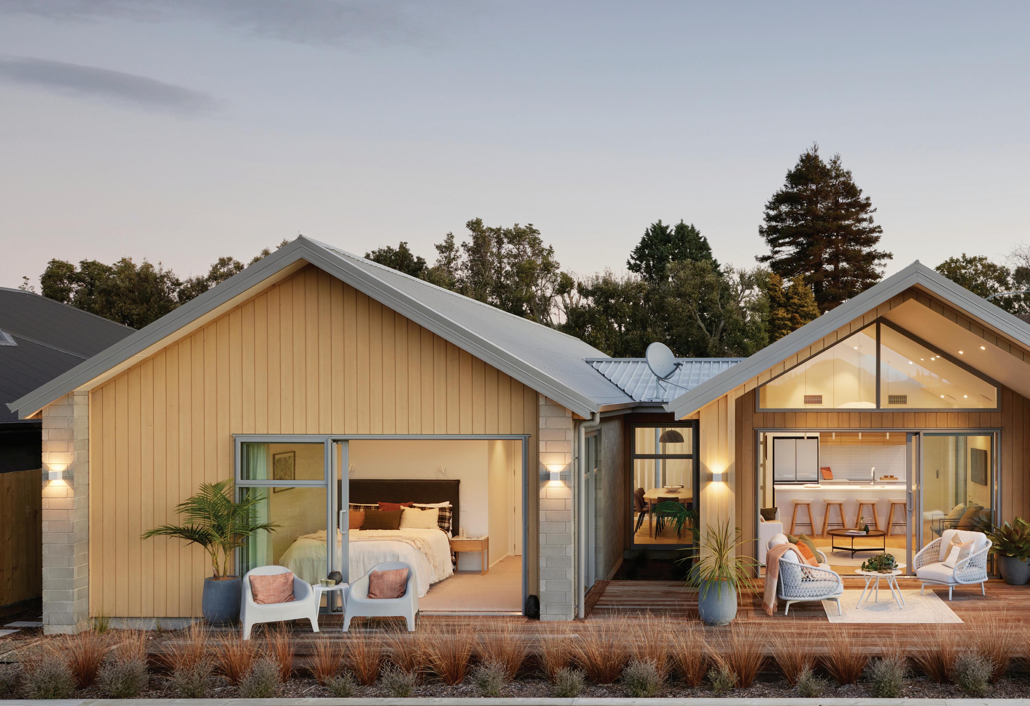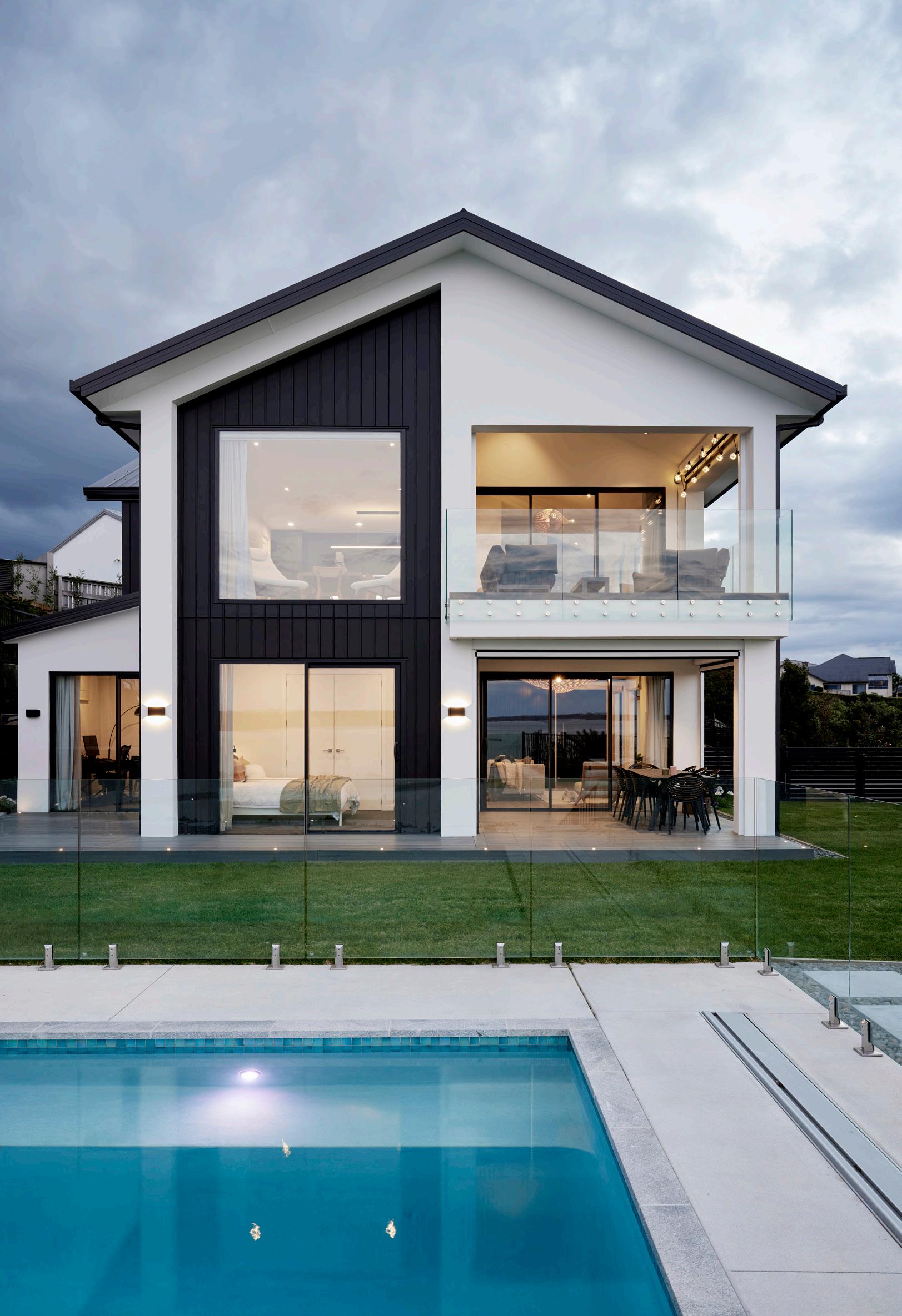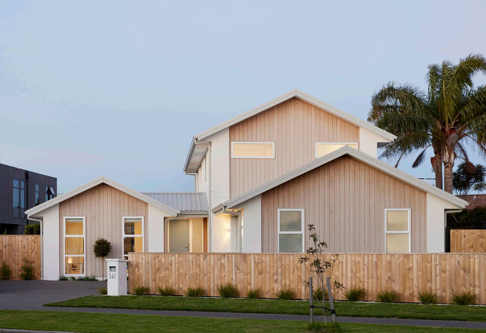 Aluminium joinery framing accentuates the gable roof lines and frames the home beautifully.