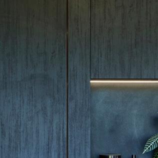 The designer kitchen complemented with black accents create a sense of flow and connectivity between the exterior and interior of the home. Bestwood Melamine cabinetry adds a textured, grained surface effect to the space. The choice of bold dark hues add a nice touch of elegance to Jimmy’s mancave.