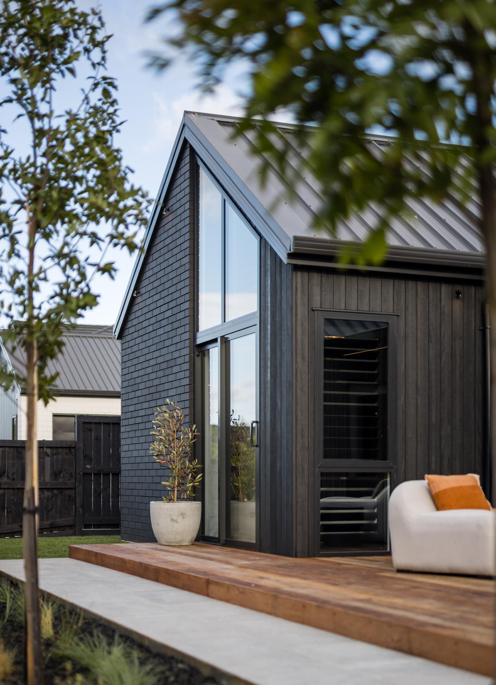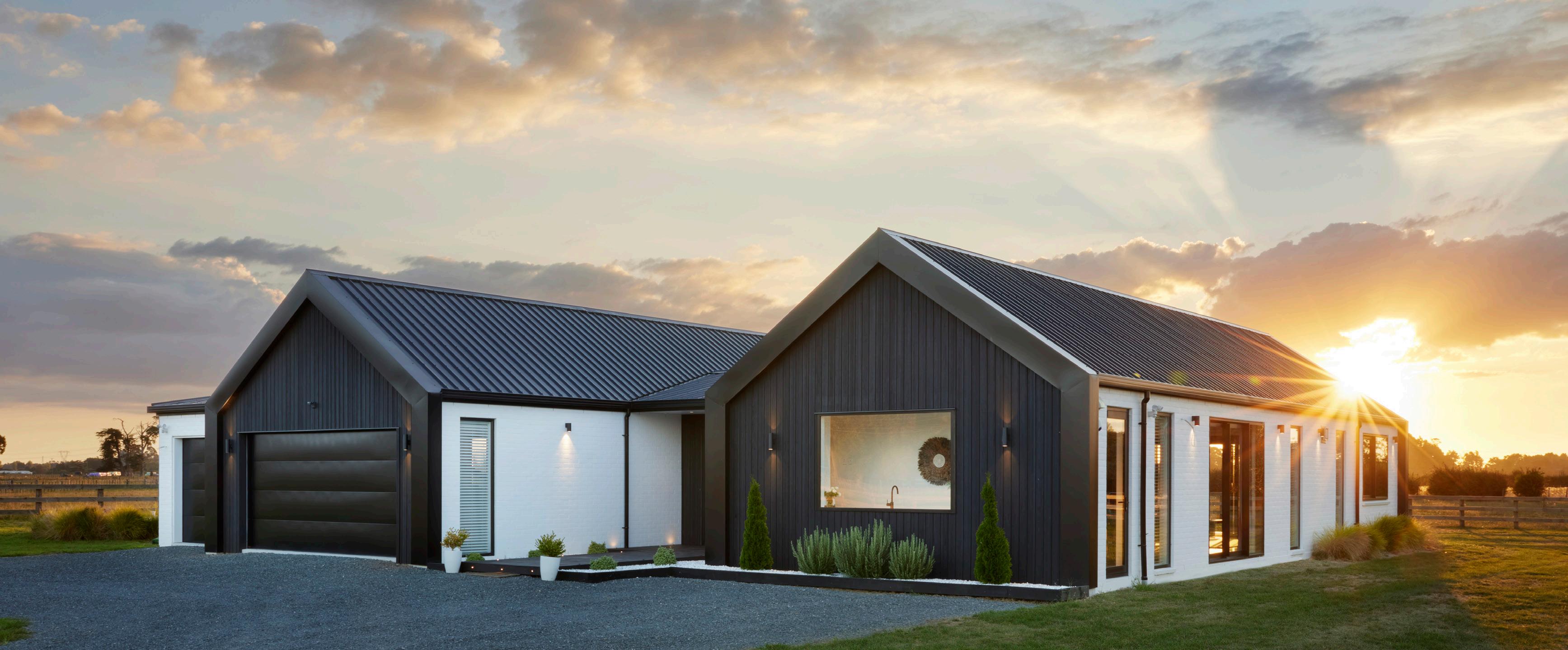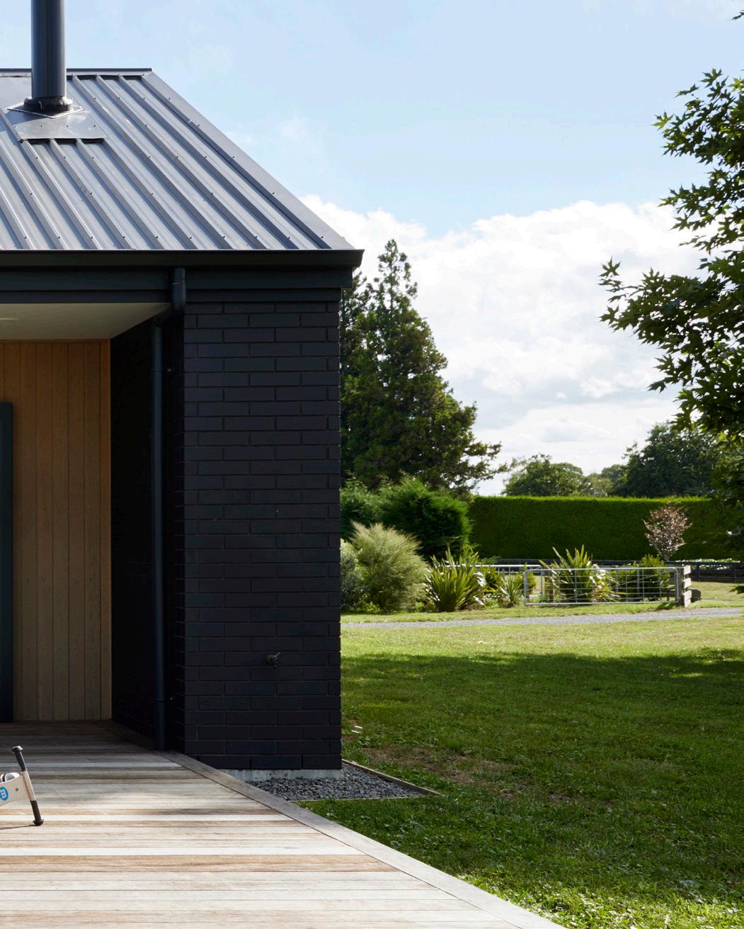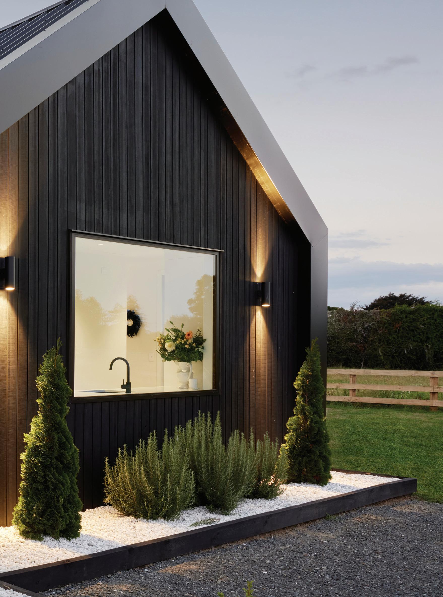 Dark, textured cladding combined with sharp white joinery creates instant modern country charm