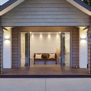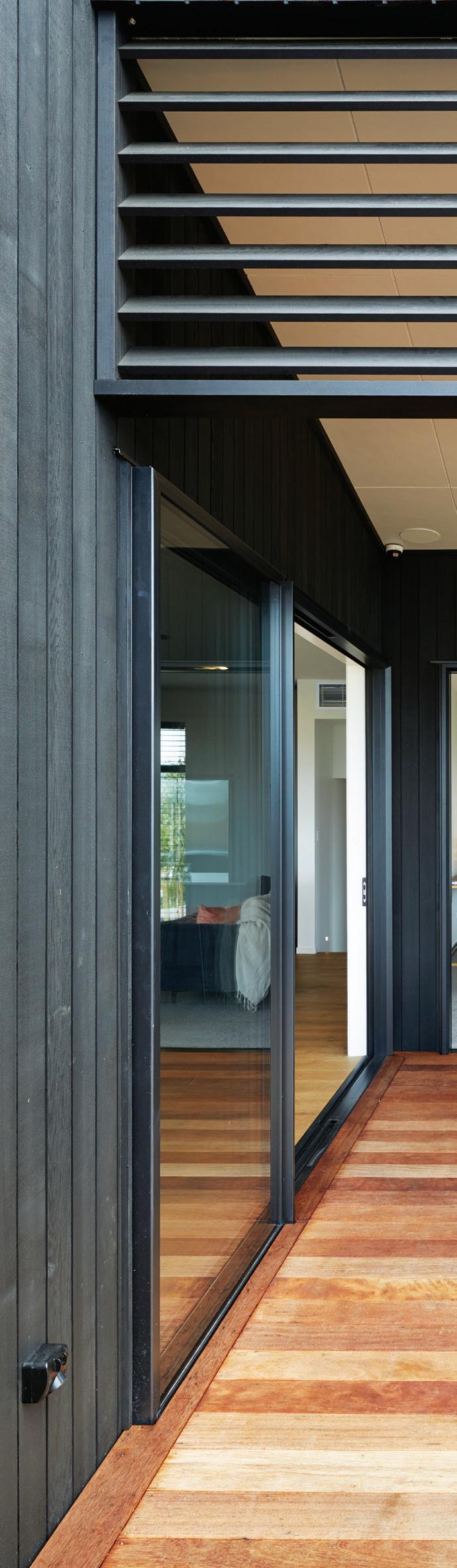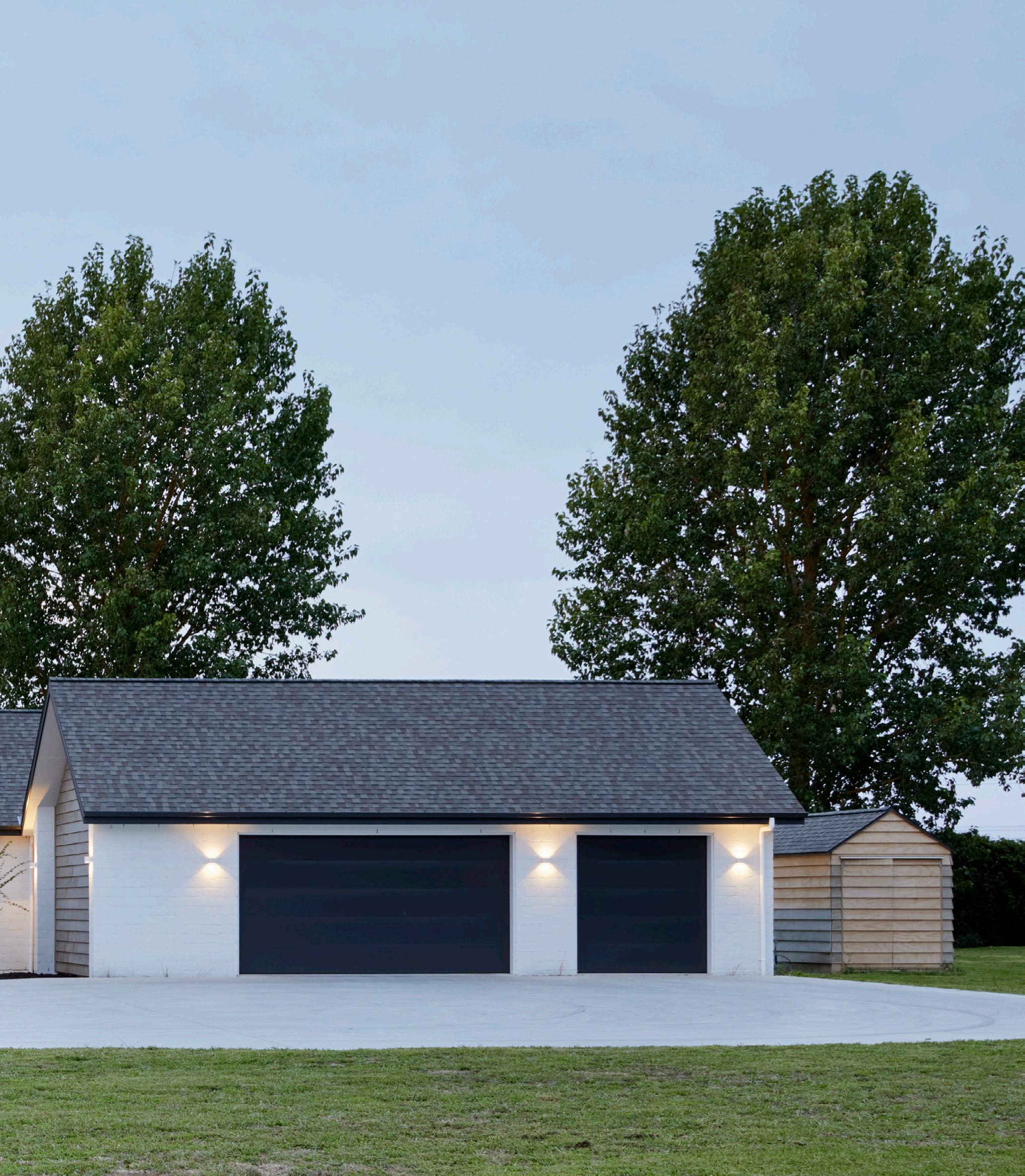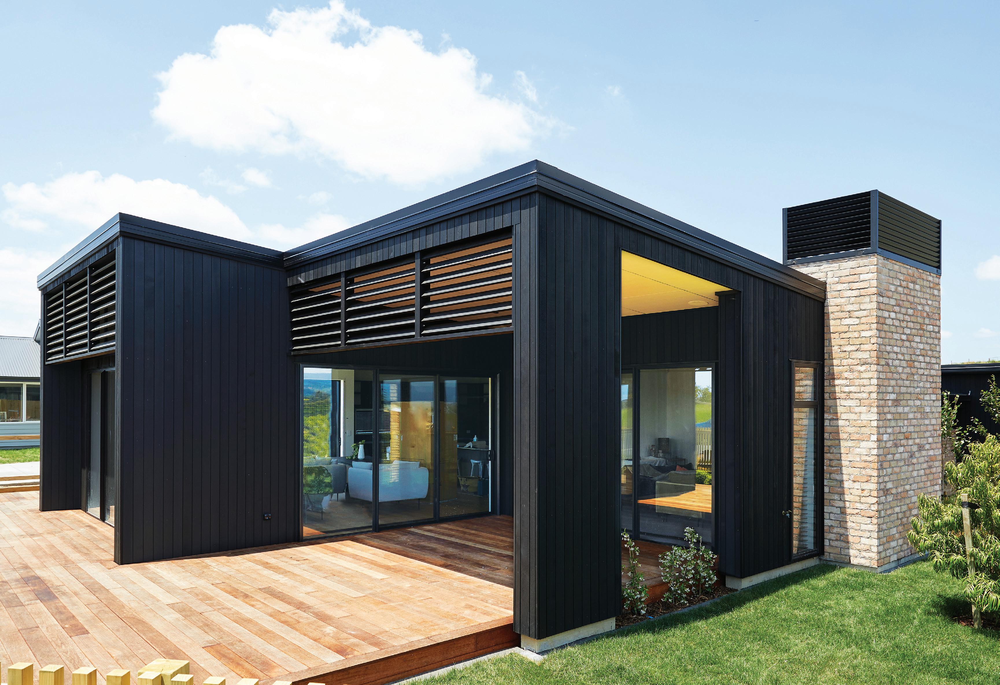 Dark, textured cladding combined with sharp white joinery creates instant modern country charm