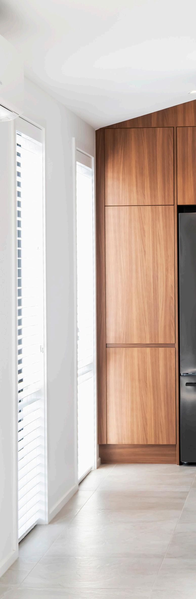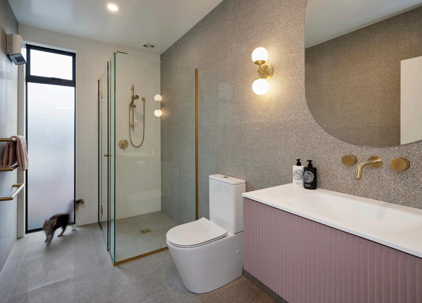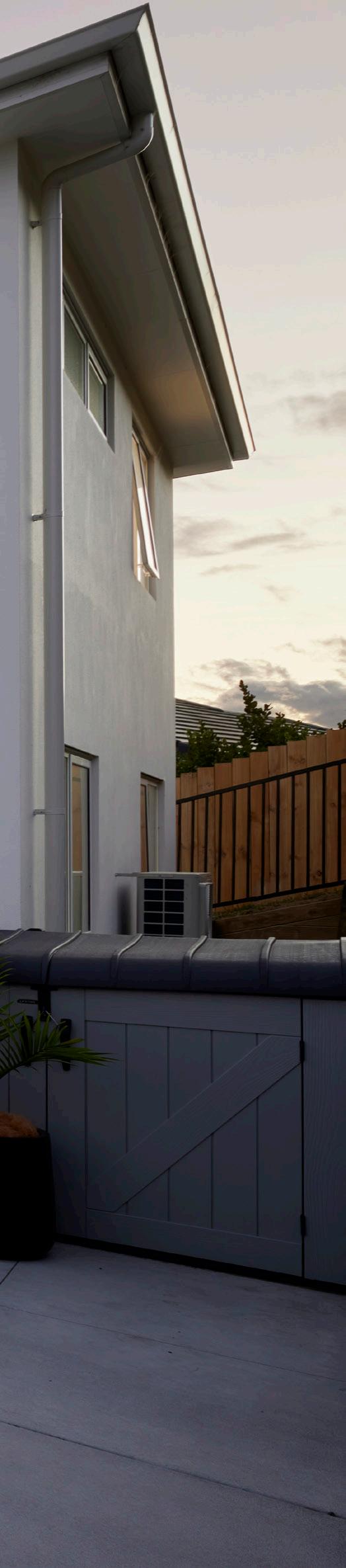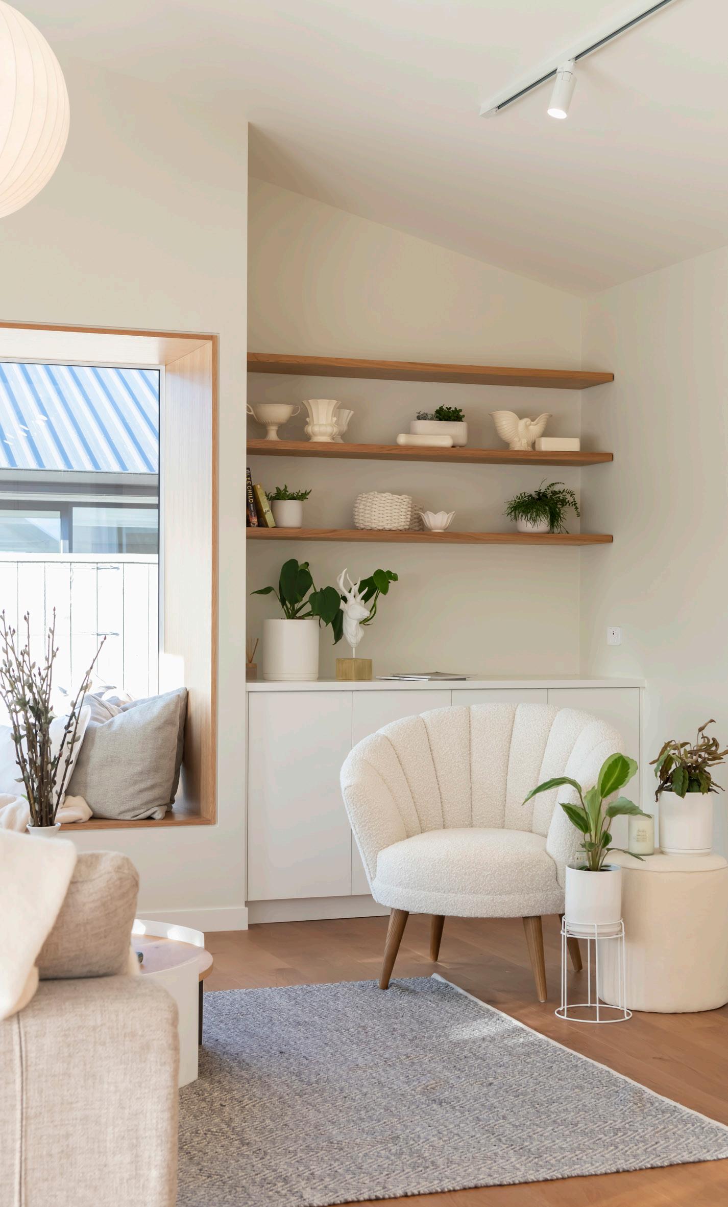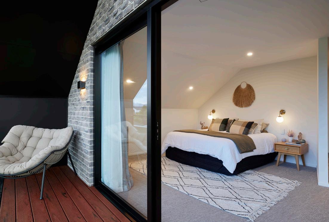The exterior cladding is a mix of Abodo timber cladding and Celcrete, which helps to create dimension to the exterior. Inside, you'll find neutral colours and pops of green and pink to showcase a bit of character and design flair.