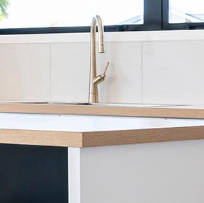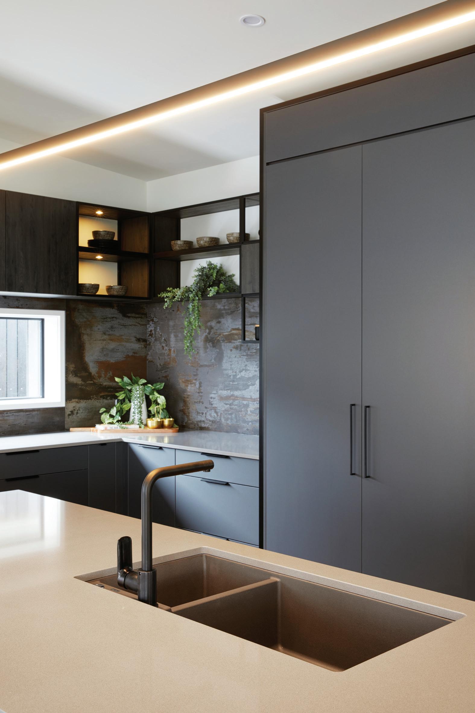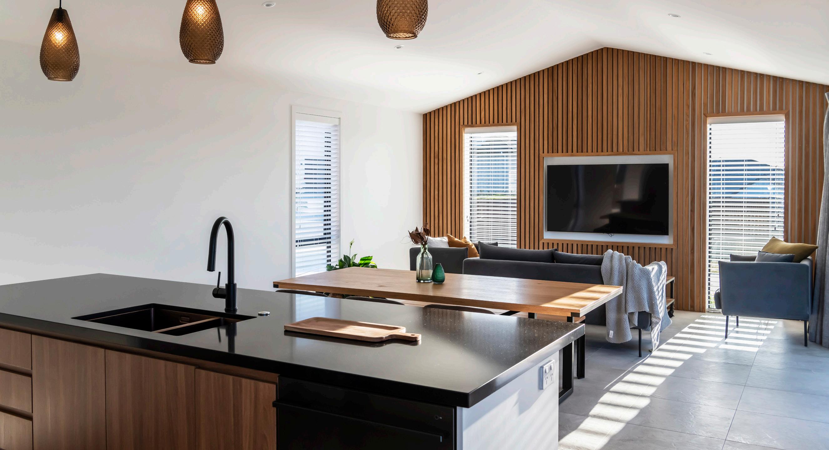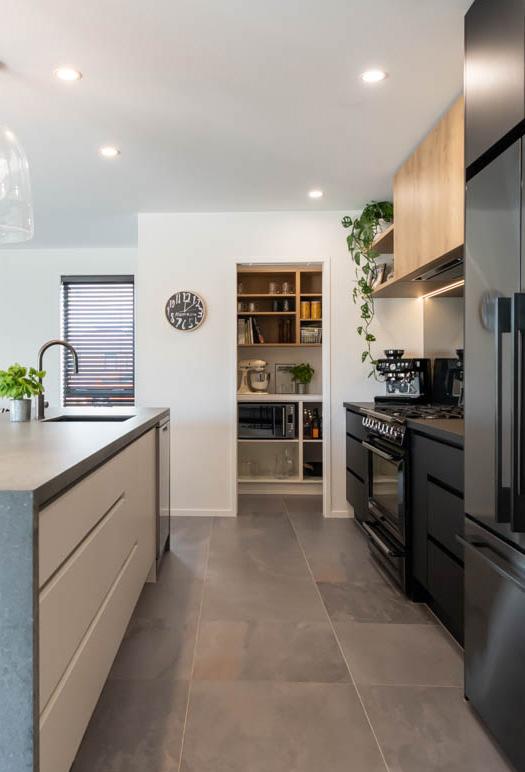 The home's exterior is a beautiful modern mix of James Hardie linea oblique weatherboard in Resene Nero, and Vulcan vertical board in Straw. An extra-large kitchen with extra bench space and hidden shelves instead of a butler's pantry was a must-have. The bright white cabinetry is perfectly complemented by stunning gold tapware and handles.