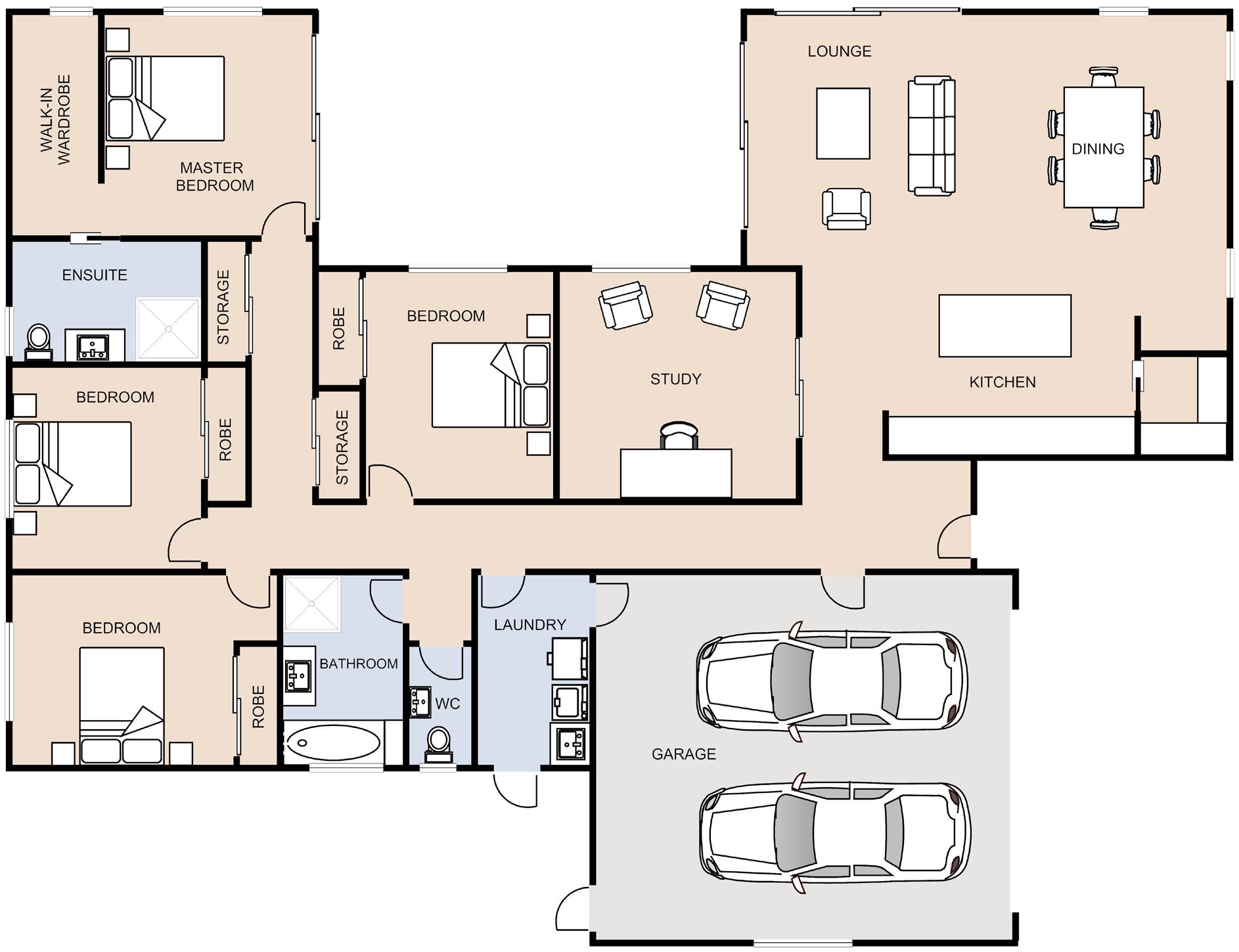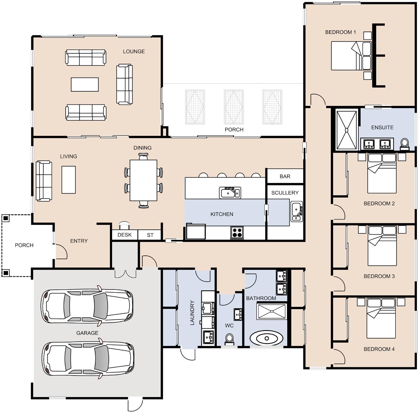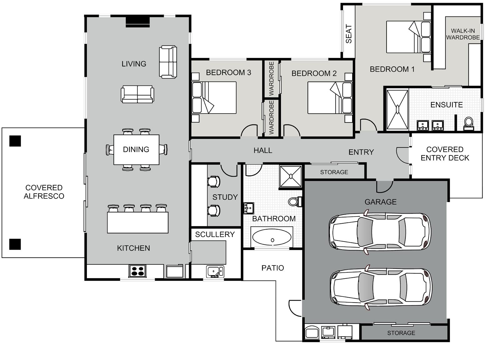 Our Brywood plan offers a clever design with all the bells and whistles, including two-living spaces, a study and three generous bedrooms.