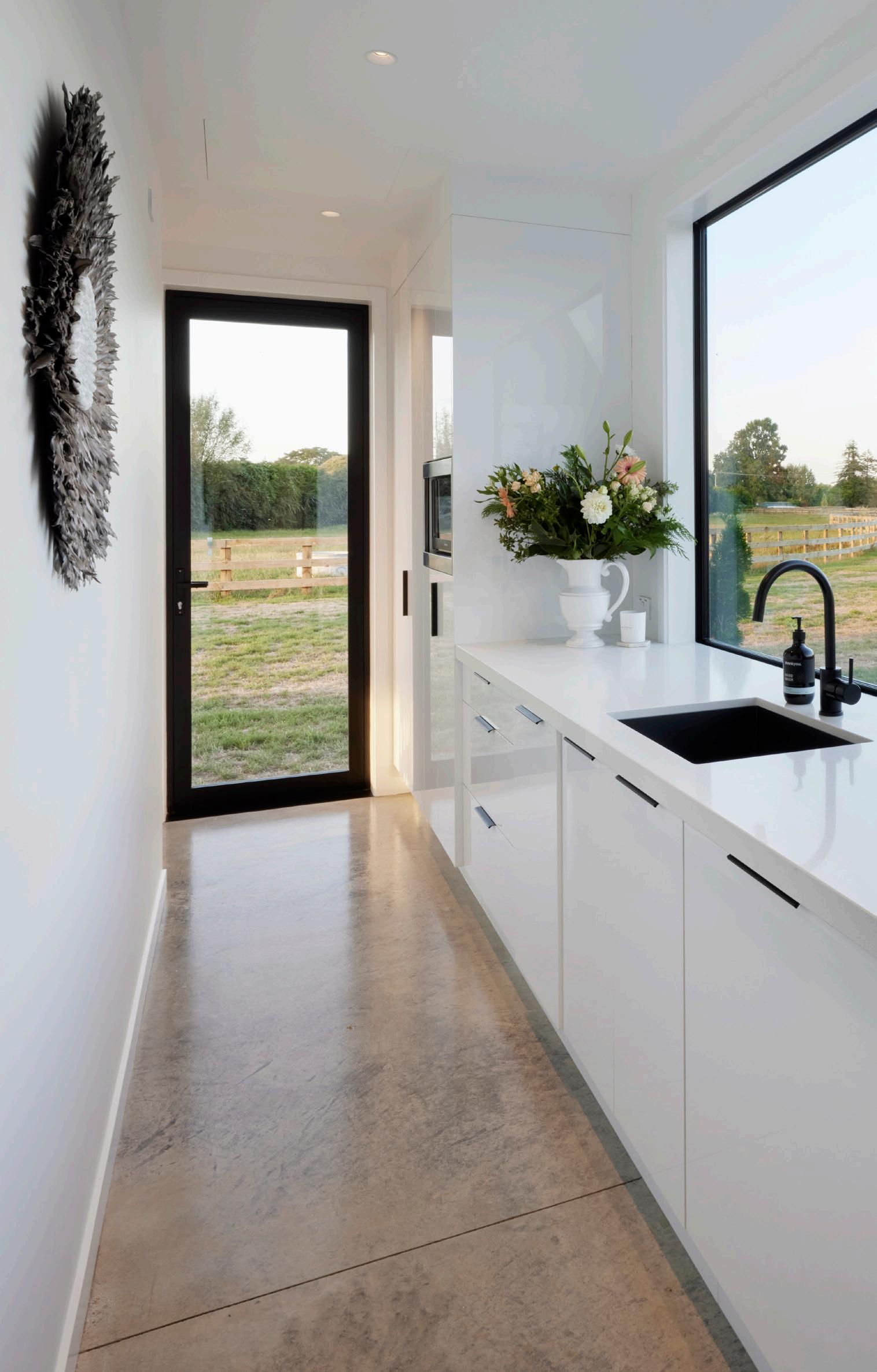 Polished concrete, a monochrome palette and shaker style doors create a modern country feel