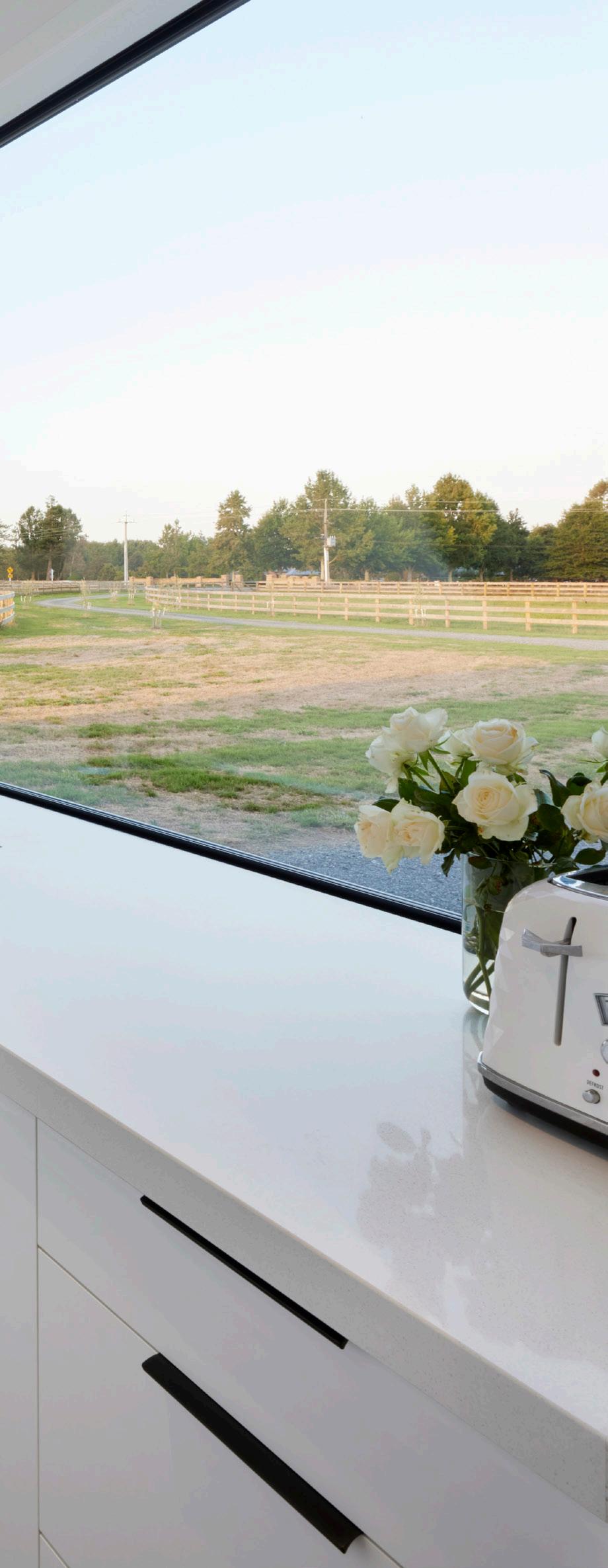 The modern barn look is achieved through soaring cathedral style ceilings, open plan living spaces, an abundance of sliding doors and large windows to welcome the outdoors inside.