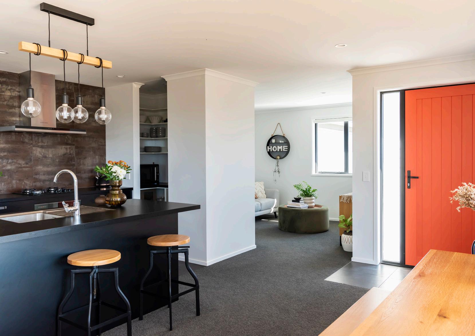 Personality was added to Hayden & Amanda’s new build with a stunning dark kitchen and bright orange front door, plus sections of James Hardie Linea weatherboard to break up the home’s brick exterior.