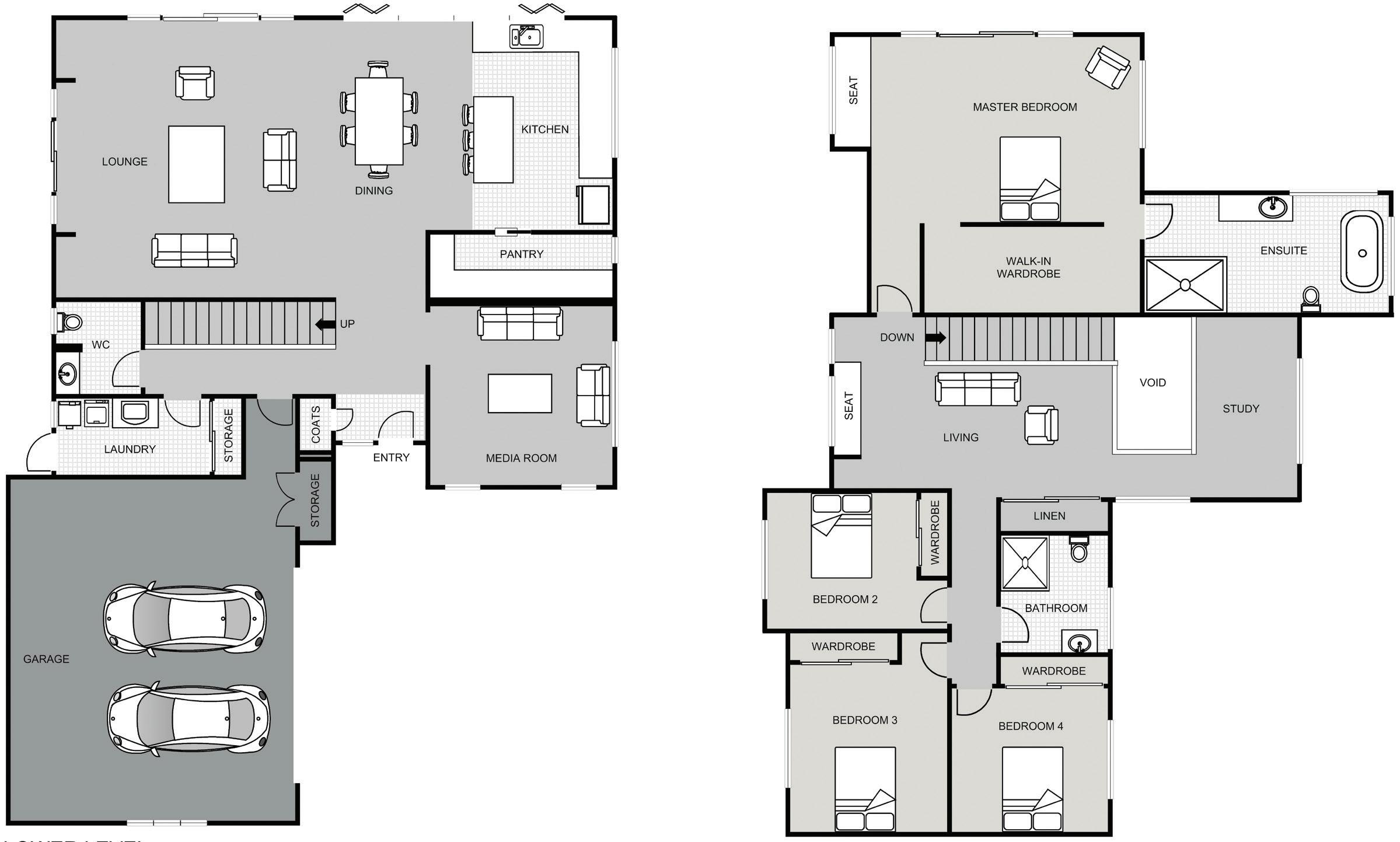 The master suite is separated from the other three bedrooms, and open-plan living is ideal for entertaining. A media room provides a cosy space for relaxation, making our Parkland plan ideal for family living.