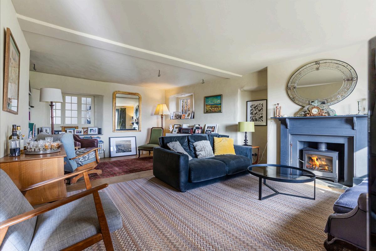 The sitting room is an elegant and inviting space, full of character, with a feature fireplace and wood burning stove Large windows frame views over the garden, creating a light yet cosy environment for relaxing,