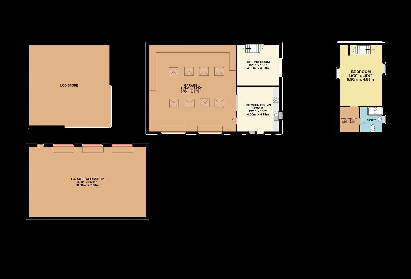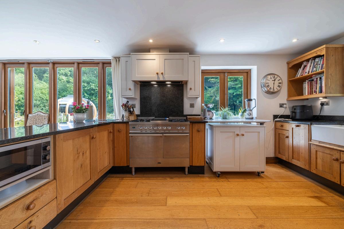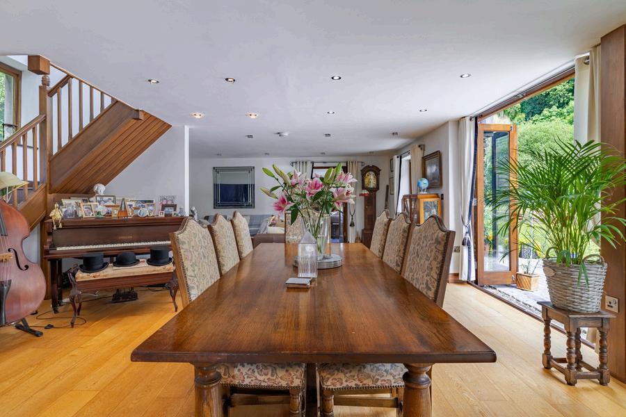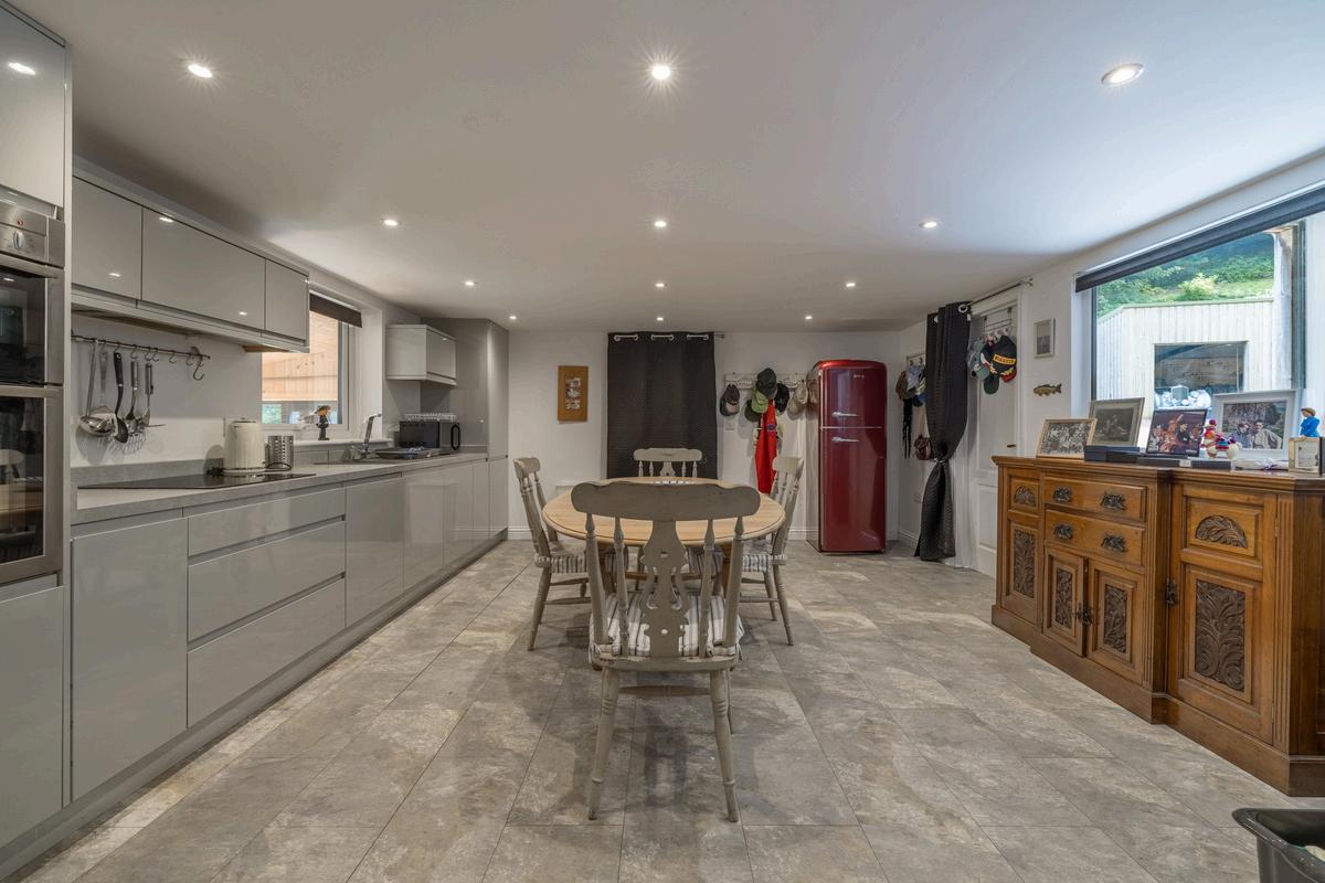 Separate generously proportioned, secondary accommodation spans two floors, featuring an open-plan kitchen, dining, and sitting area with sliding doors that open to a veranda with a hot tub This space includes a double bedroom with a dressing room and an en-suite shower room